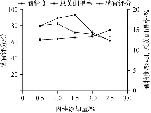 单因素试验:在上述工艺流程基础上,以感官评分为主要评价指标,酒精度、总黄酮得率为参考指标,分别考察初始糖度(18°Bx、20°Bx、22°Bx、24°Bx、26°Bx)、酵母添加量(0.01%、0.02%、0.03%、0.04%、0.05%)、主发酵时间(6 d、10 d、14 d、18 d、22 d)和肉桂粉添加量(0.5%、1%、1.5%、2%、2.5%)对肉桂毛葡萄酒品质的影响。