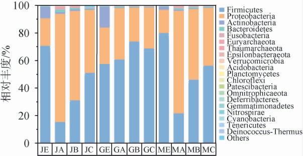 样品 观测物种数 Chao1指数 Shannon指数 测序覆盖率/%JE JA JB JC GE GA GB GC 151.33±68.19b 284.33±27.43a 171.67±16.17b 181.67±75.98b 118.00±17.35b 135.33±13.80b 125.33±45.76b 120.00±31.61b 158.08±75.73b 303.89±41.80a 175.85±16.58b 189.61±82.77b 119.22±18.32b 138.24±11.40b 130.88±48.13b 125.70±39.03b 2.63±0.34ab 2.20±0.15bcd 2.39±0.16abcd 2.00±0.25d 2.80±0.12a 2.28±0.13bcd 2.03±0.57d 2.04±0.08d 100 100 100 100 100 100 100 100