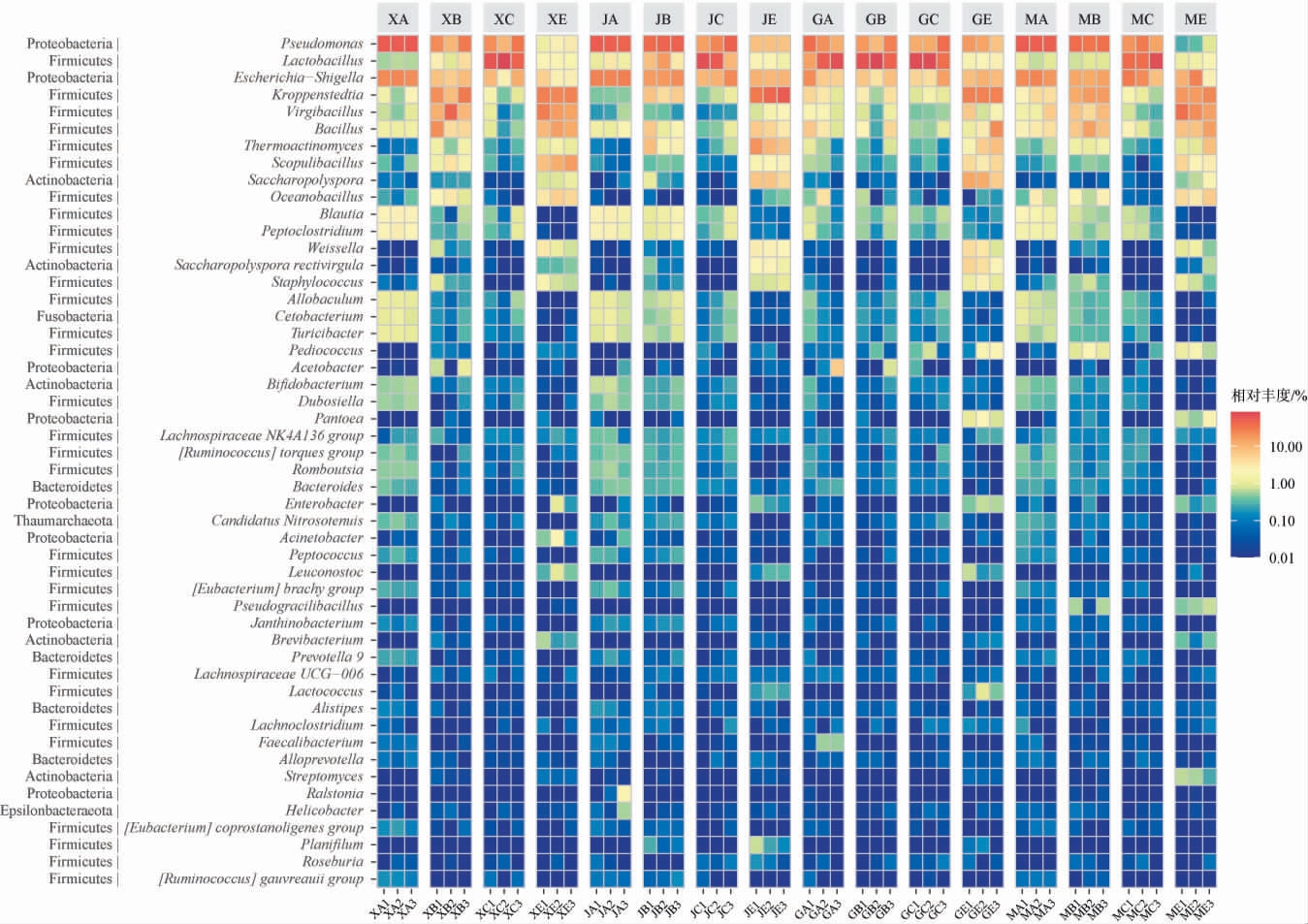 从贵州不同地区酱香型白酒四轮次发酵大曲和酒醅样品中共鉴定出412个细菌属,包括19个优势细菌属,其中平均丰度排名前50的细菌属见图3。厚壁菌门在属水平上的优势微生物(相对丰度>1%)主要有乳酸杆菌属(Lactobacillus)(0.96%~49.86%)、克罗彭斯特菌属(Kroppenstedtia)(0.45%~42.58%)、枝芽胞杆菌属(Virgibacillus)(0.16%~24.75%)、芽孢杆菌属(Bacillus)(0.64%~10.29%)、高温放线菌属(Thermoactinomyces)(0.08%~12.13%)、火山渣芽孢杆菌属(Scopulibacillus)(0.06%~3.86%)和大洋芽孢杆菌属(Oceanobacillus)(0.01%~4.44%)等15个属;变形菌门在属水平上的优势微生物是假单胞菌属(Pseudomonas)(0.50%~51.10%)、大肠埃希氏菌属-志贺氏菌属(Escherichia-Shigella)(6.24%~26.07%)、醋杆菌属(Acetobacter)(0~2.03%)和泛生菌属(Pantoea)(0~1.34%)。这些优势细菌属组成与黄廷财等[5,13,18-20]对贵州地区酱香型白酒酿造过程中的优势细菌属的研究结果基本一致。