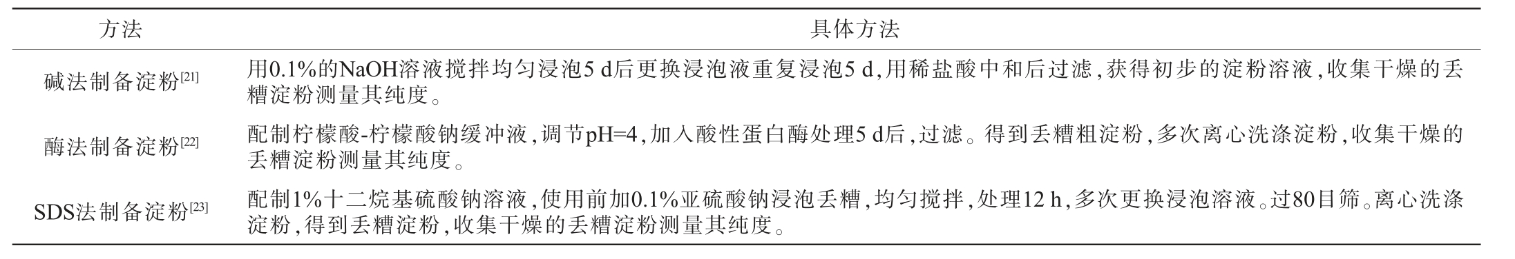 方法 具体方法碱法制备淀粉[21]酶法制备淀粉[22]SDS法制备淀粉[23]用0.1%的NaOH溶液搅拌均匀浸泡5 d后更换浸泡液重复浸泡5 d,用稀盐酸中和后过滤,获得初步的淀粉溶液,收集干燥的丢糟淀粉测量其纯度。配制柠檬酸-柠檬酸钠缓冲液,调节pH=4,加入酸性蛋白酶处理5 d后,过滤。得到丢糟粗淀粉,多次离心洗涤淀粉,收集干燥的丢糟淀粉测量其纯度。配制1%十二烷基硫酸钠溶液,使用前加0.1%亚硫酸钠浸泡丢糟,均匀搅拌,处理12 h,多次更换浸泡溶液。过80目筛。离心洗涤淀粉,得到丢糟淀粉,收集干燥的丢糟淀粉测量其纯度。