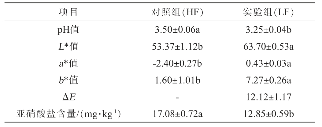 项目 对照组(HF)实验组(LF)pH值L*值a*值b*值ΔE亚硝酸盐含量/(mg·kg-1)3.50±0.06a 53.37±1.12b-2.40±0.27b 1.60±1.01b-17.08±0.72a 3.25±0.04b 63.70±0.53a 0.43±0.03a 7.27±0.26a 12.12±1.17 12.85±0.59b