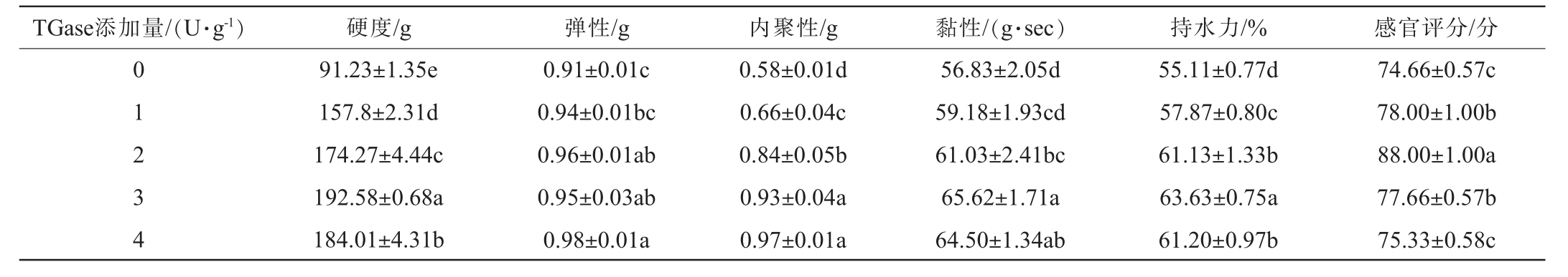 TGase添加量/(U·g-1)硬度/g 弹性/g 内聚性/g 黏性/(g·sec)持水力/% 感官评分/分0 1 2 3 4 91.23±1.35e 157.8±2.31d 174.27±4.44c 192.58±0.68a 184.01±4.31b 0.91±0.01c 0.94±0.01bc 0.96±0.01ab 0.95±0.03ab 0.98±0.01a 0.58±0.01d 0.66±0.04c 0.84±0.05b 0.93±0.04a 0.97±0.01a 56.83±2.05d 59.18±1.93cd 61.03±2.41bc 65.62±1.71a 64.50±1.34ab 55.11±0.77d 57.87±0.80c 61.13±1.33b 63.63±0.75a 61.20±0.97b 74.66±0.57c 78.00±1.00b 88.00±1.00a 77.66±0.57b 75.33±0.58c