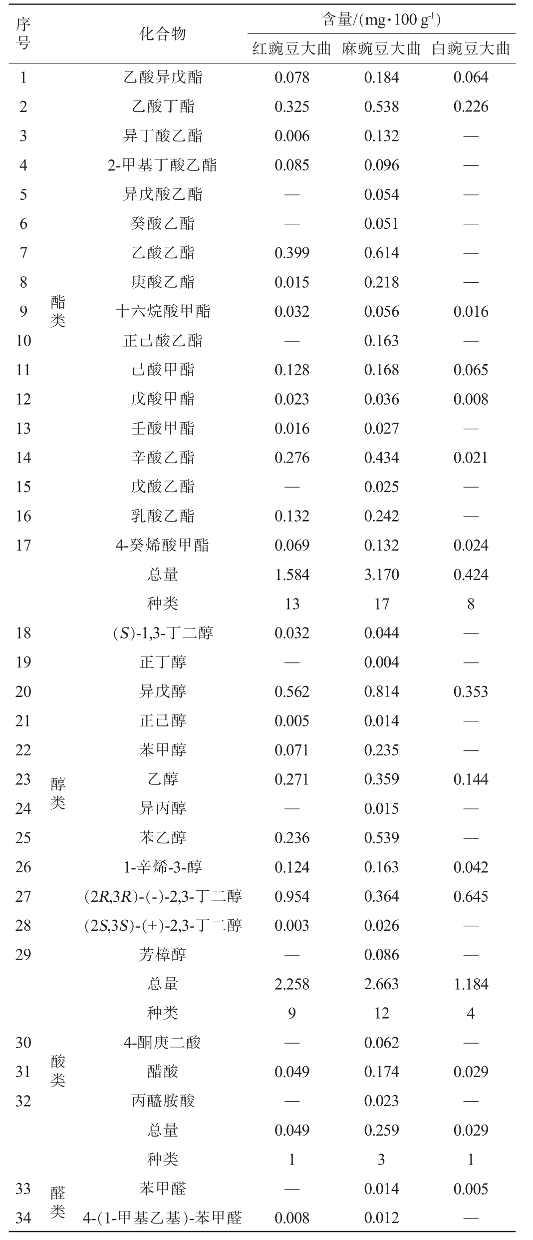 红豌豆成曲挥发性风味物质含量较高,其酯类物质、醇类物质、酸类物质、酮类物质、醛类物质和吡嗪类物质总含量分别为1.584 mg/100 g、2.258 mg/100 g、0.049 mg/100 g、0.044 mg/100 g、0.045 mg/100 g和0.110 mg/100 g,其醇类物质中(2R,3R)-(-)-2,3-丁二醇和异戊醇含量较高,可达0.954 mg/100 g和0.562 mg/100 g。