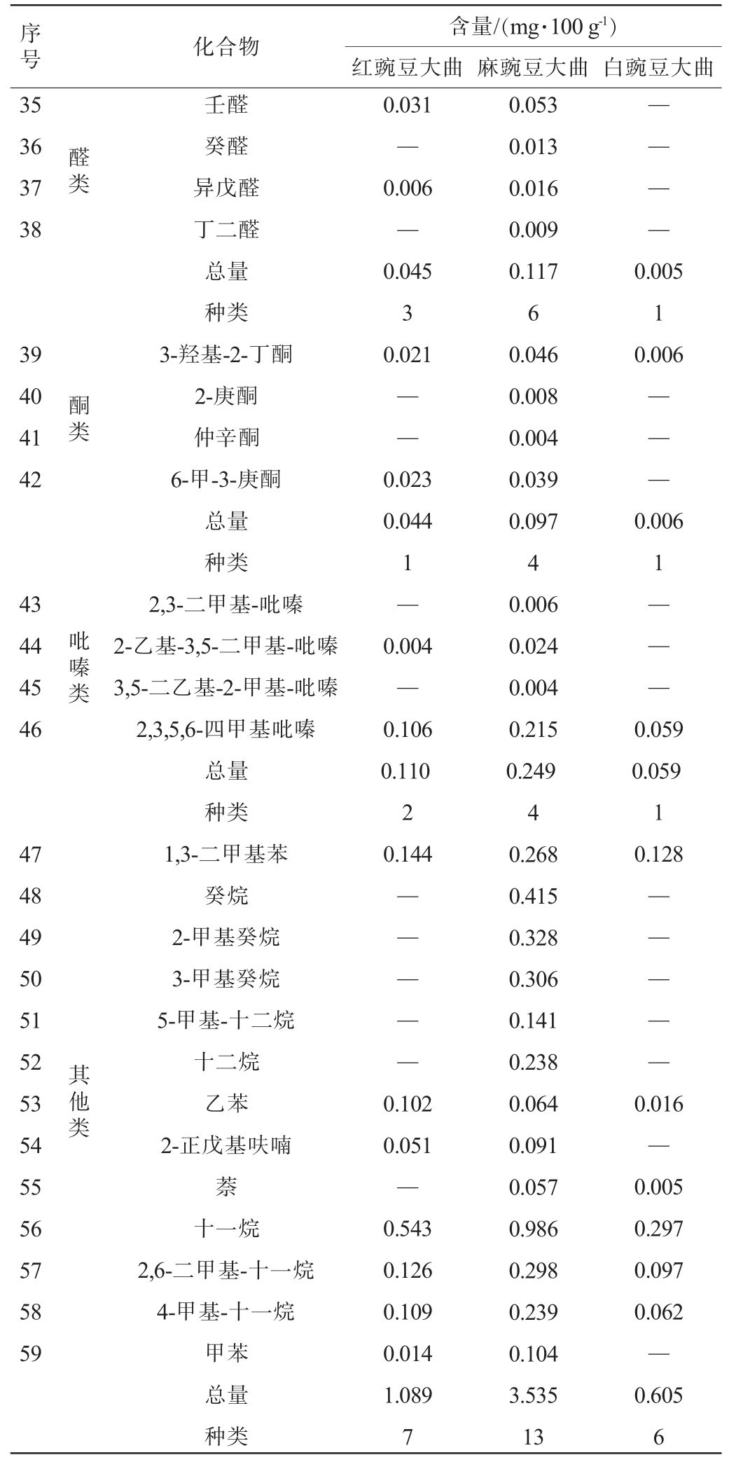 序号化合物含量/(mg·100 g-1)红豌豆大曲 麻豌豆大曲 白豌豆大曲35 36 37 38醛类——39 40 41 42 0.031—0.006—0.045 3 0.021 0.005 1 0.006酮类 吡嗪类壬醛癸醛异戊醛丁二醛总量种类3-羟基-2-丁酮2-庚酮仲辛酮6-甲-3-庚酮总量种类2,3-二甲基-吡嗪2-乙基-3,5-二甲基-吡嗪3,5-二乙基-2-甲基-吡嗪2,3,5,6-四甲基吡嗪总量种类1,3-二甲基苯癸烷2-甲基癸烷3-甲基癸烷5-甲基-十二烷十二烷乙苯2-正戊基呋喃萘十一烷2,6-二甲基-十一烷4-甲基-十一烷甲苯总量种类——0.023 0.044——0.006 43 44 45 46 1—1——47 48 49 50 51 52 53 54 55 56 57 58 59 0.004—0.106 0.110 2 0.144 0.059 0.059 1 0.128其他类————0.102 0.051—0.543 0.126 0.109 0.014 1.089 7 0.053 0.013 0.016 0.009 0.117 6 0.046 0.008 0.004 0.039 0.097 4 0.006 0.024 0.004 0.215 0.249 4 0.268 0.415 0.328 0.306 0.141 0.238 0.064 0.091 0.057 0.986 0.298 0.239 0.104 3.535 13 0.016—0.005 0.297 0.097 0.062—0.605 6