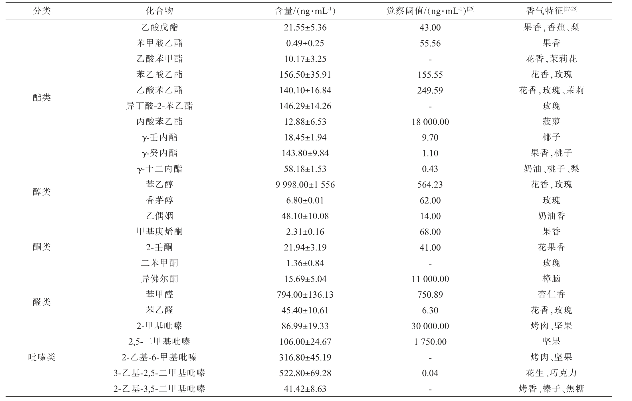 分类 化合物 含量/(ng·mL-1)觉察阈值/(ng·mL-1)[26] 香气特征[27-28]酯类醇类酮类醛类吡嗪类乙酸戊酯苯甲酸乙酯乙酸苯甲酯苯乙酸乙酯乙酸苯乙酯异丁酸-2-苯乙酯丙酸苯乙酯γ-壬内酯γ-癸内酯γ-十二内酯苯乙醇香茅醇乙偶姻甲基庚烯酮2-壬酮二苯甲酮异佛尔酮苯甲醛苯乙醛2-甲基吡嗪2,5-二甲基吡嗪2-乙基-6-甲基吡嗪3-乙基-2,5-二甲基吡嗪2-乙基-3,5-二甲基吡嗪21.55±5.36 0.49±0.25 10.17±3.25 156.50±35.91 140.10±16.84 146.29±14.26 12.88±6.53 18.45±1.94 143.80±9.84 58.18±1.53 9 998.00±1 556 6.80±0.01 48.10±10.08 2.31±0.16 21.94±3.19 1.36±0.84 15.69±5.04 794.00±136.13 45.40±10.61 86.99±19.33 106.00±24.67 316.80±45.19 522.80±69.28 41.42±8.63 43.00 55.56-155.55 249.59-18 000.00 9.70 1.10 0.43 564.23 62.00 14.00 68.00 41.00-11 000.00 750.89 6.30 30 000.00 1 750.00-0.04-果香,香蕉、梨果香花香,茉莉花花香,玫瑰花香,玫瑰、茉莉玫瑰菠萝椰子果香,桃子奶油、桃子、梨花香,玫瑰玫瑰奶油香果香花果香玫瑰樟脑杏仁香花香,玫瑰烤肉、坚果坚果烤肉、坚果花生、巧克力烤香、榛子、焦糖