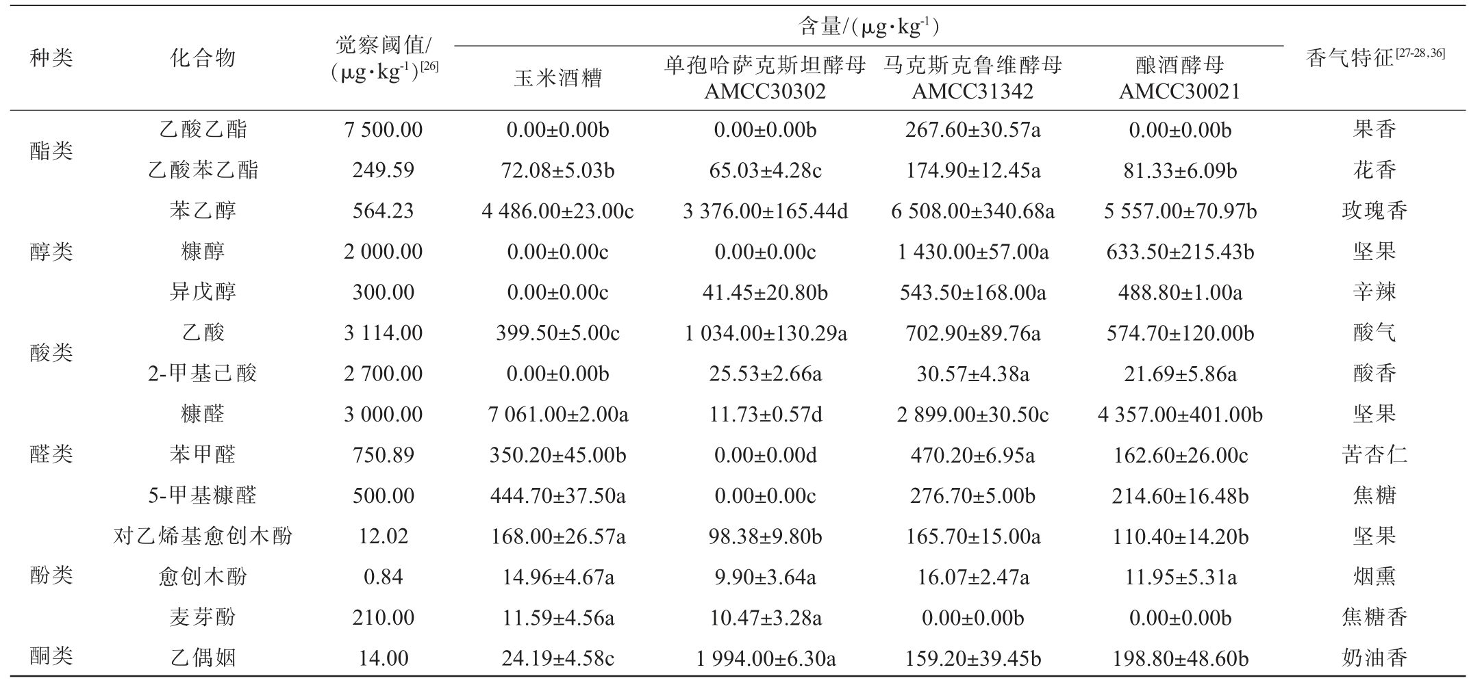种类 化合物 觉察阈值/(μg·kg-1)[26] 香气特征[27-28,36]含量/(μg·kg-1)玉米酒糟 单孢哈萨克斯坦酵母AMCC30302马克斯克鲁维酵母AMCC31342酿酒酵母AMCC30021酯类醇类酸类醛类酚类酮类乙酸乙酯乙酸苯乙酯苯乙醇糠醇异戊醇乙酸2-甲基己酸糠醛苯甲醛5-甲基糠醛对乙烯基愈创木酚愈创木酚麦芽酚乙偶姻7 500.00 249.59 564.23 2 000.00 300.00 3 114.00 2 700.00 3 000.00 750.89 500.00 12.02 0.84 210.00 14.00 0.00±0.00b 72.08±5.03b 4 486.00±23.00c 0.00±0.00c 0.00±0.00c 399.50±5.00c 0.00±0.00b 7 061.00±2.00a 350.20±45.00b 444.70±37.50a 168.00±26.57a 14.96±4.67a 11.59±4.56a 24.19±4.58c 0.00±0.00b 65.03±4.28c 3 376.00±165.44d 0.00±0.00c 41.45±20.80b 1 034.00±130.29a 25.53±2.66a 11.73±0.57d 0.00±0.00d 0.00±0.00c 98.38±9.80b 9.90±3.64a 10.47±3.28a 1 994.00±6.30a 267.60±30.57a 174.90±12.45a 6 508.00±340.68a 1 430.00±57.00a 543.50±168.00a 702.90±89.76a 30.57±4.38a 2 899.00±30.50c 470.20±6.95a 276.70±5.00b 165.70±15.00a 16.07±2.47a 0.00±0.00b 159.20±39.45b 0.00±0.00b 81.33±6.09b 5 557.00±70.97b 633.50±215.43b 488.80±1.00a 574.70±120.00b 21.69±5.86a 4 357.00±401.00b 162.60±26.00c 214.60±16.48b 110.40±14.20b 11.95±5.31a 0.00±0.00b 198.80±48.60b果香花香玫瑰香坚果辛辣酸气酸香坚果苦杏仁焦糖坚果烟熏焦糖香奶油香