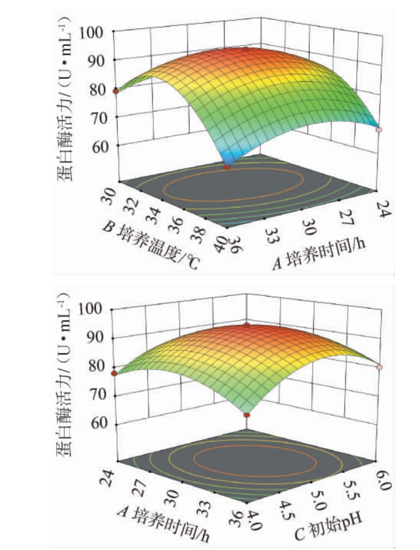 响应面越陡峭、等高线越椭圆说明各因素间交互作用影响越大,相反交互作用影响越小。由图7可知,AB、AC交互作用对蛋白酶活力影响的响应面均呈凸面,坡度陡峭,等高线呈椭圆形,说明对蛋白酶活力影响较大,这与方差分析结果一致。