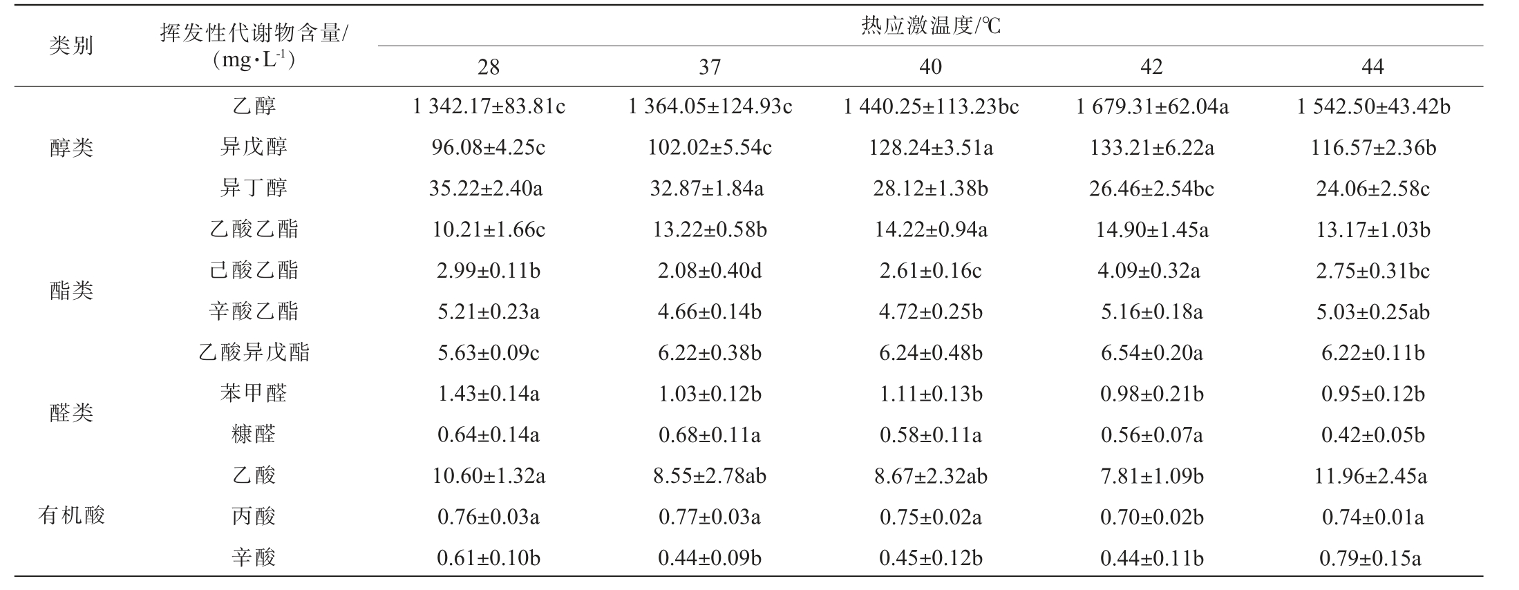 类别 挥发性代谢物含量/(mg·L-1)28 37热应激温度/℃40 42 44醇类酯类醛类有机酸乙醇异戊醇异丁醇乙酸乙酯己酸乙酯辛酸乙酯乙酸异戊酯苯甲醛糠醛乙酸丙酸辛酸1 342.17±83.81c 96.08±4.25c 35.22±2.40a 10.21±1.66c 2.99±0.11b 5.21±0.23a 5.63±0.09c 1.43±0.14a 0.64±0.14a 10.60±1.32a 0.76±0.03a 0.61±0.10b 1 364.05±124.93c 102.02±5.54c 32.87±1.84a 13.22±0.58b 2.08±0.40d 4.66±0.14b 6.22±0.38b 1.03±0.12b 0.68±0.11a 8.55±2.78ab 0.77±0.03a 0.44±0.09b 1 440.25±113.23bc 128.24±3.51a 28.12±1.38b 14.22±0.94a 2.61±0.16c 4.72±0.25b 6.24±0.48b 1.11±0.13b 0.58±0.11a 8.67±2.32ab 0.75±0.02a 0.45±0.12b 1 679.31±62.04a 133.21±6.22a 26.46±2.54bc 14.90±1.45a 4.09±0.32a 5.16±0.18a 6.54±0.20a 0.98±0.21b 0.56±0.07a 7.81±1.09b 0.70±0.02b 0.44±0.11b 1 542.50±43.42b 116.57±2.36b 24.06±2.58c 13.17±1.03b 2.75±0.31bc 5.03±0.25ab 6.22±0.11b 0.95±0.12b 0.42±0.05b 11.96±2.45a 0.74±0.01a 0.79±0.15a