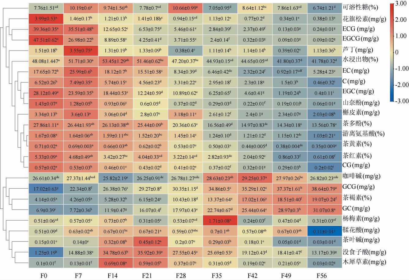 Fig.2 Heat map of cluster analysis of physicochemical indicators and active components during the fermentation process of ripened Pu-erh tea