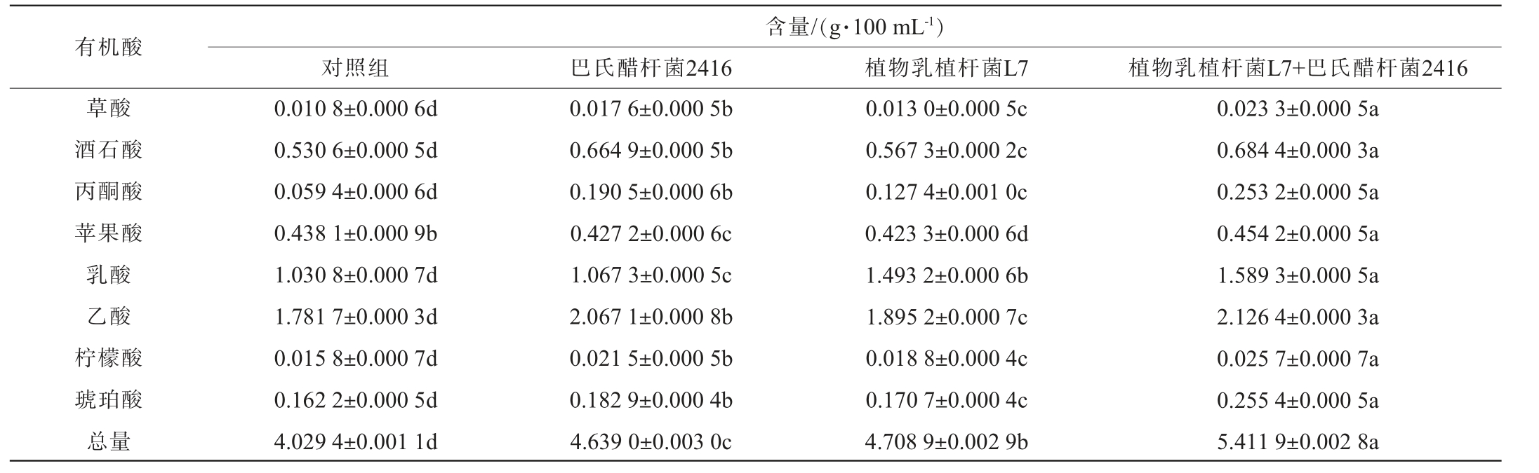含量/(g·100 mL-1)对照组 巴氏醋杆菌2416 植物乳植杆菌L7 植物乳植杆菌L7+巴氏醋杆菌2416草酸酒石酸丙酮酸苹果酸乳酸乙酸柠檬酸琥珀酸总量0.010 8±0.000 6d 0.530 6±0.000 5d 0.059 4±0.000 6d 0.438 1±0.000 9b 1.030 8±0.000 7d 1.781 7±0.000 3d 0.015 8±0.000 7d 0.162 2±0.000 5d 4.029 4±0.001 1d 0.017 6±0.000 5b 0.664 9±0.000 5b 0.190 5±0.000 6b 0.427 2±0.000 6c 1.067 3±0.000 5c 2.067 1±0.000 8b 0.021 5±0.000 5b 0.182 9±0.000 4b 4.639 0±0.003 0c 0.013 0±0.000 5c 0.567 3±0.000 2c 0.127 4±0.001 0c 0.423 3±0.000 6d 1.493 2±0.000 6b 1.895 2±0.000 7c 0.018 8±0.000 4c 0.170 7±0.000 4c 4.708 9±0.002 9b 0.023 3±0.000 5a 0.684 4±0.000 3a 0.253 2±0.000 5a 0.454 2±0.000 5a 1.589 3±0.000 5a 2.126 4±0.000 3a 0.025 7±0.000 7a 0.255 4±0.000 5a 5.411 9±0.002 8a