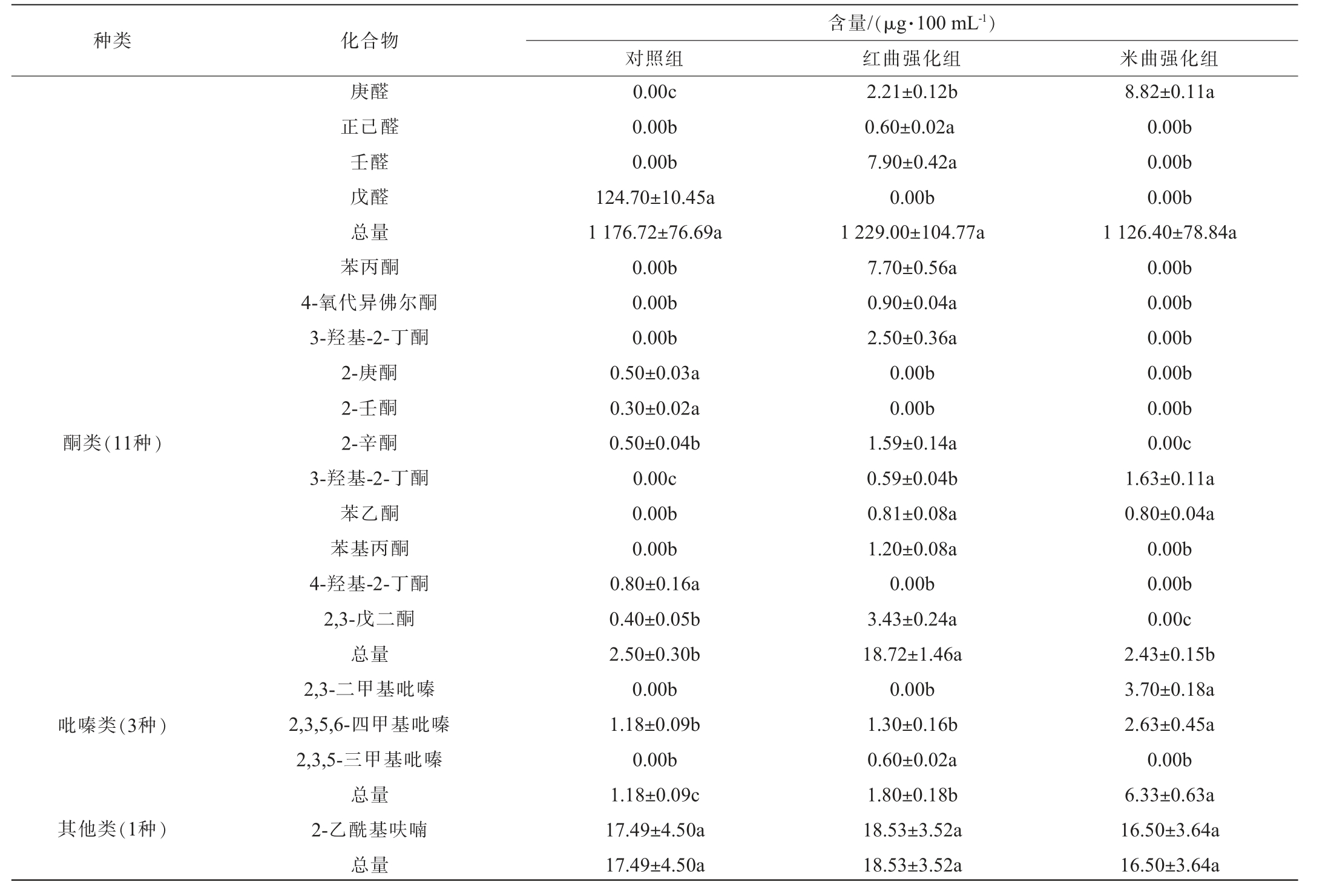 种类 化合物对照组含量/(μg·100 mL-1)红曲强化组 米曲强化组酮类(11种)吡嗪类(3种)其他类(1种)庚醛正己醛壬醛戊醛总量苯丙酮4-氧代异佛尔酮3-羟基-2-丁酮2-庚酮2-壬酮2-辛酮3-羟基-2-丁酮苯乙酮苯基丙酮4-羟基-2-丁酮2,3-戊二酮总量2,3-二甲基吡嗪2,3,5,6-四甲基吡嗪2,3,5-三甲基吡嗪总量2-乙酰基呋喃总量0.00c 0.00b 0.00b 124.70±10.45a 1 176.72±76.69a 0.00b 0.00b 0.00b 0.50±0.03a 0.30±0.02a 0.50±0.04b 0.00c 0.00b 0.00b 0.80±0.16a 0.40±0.05b 2.50±0.30b 0.00b 1.18±0.09b 0.00b 1.18±0.09c 17.49±4.50a 17.49±4.50a 2.21±0.12b 0.60±0.02a 7.90±0.42a 0.00b 1 229.00±104.77a 7.70±0.56a 0.90±0.04a 2.50±0.36a 0.00b 0.00b 1.59±0.14a 0.59±0.04b 0.81±0.08a 1.20±0.08a 0.00b 3.43±0.24a 18.72±1.46a 0.00b 1.30±0.16b 0.60±0.02a 1.80±0.18b 18.53±3.52a 18.53±3.52a 8.82±0.11a 0.00b 0.00b 0.00b 1 126.40±78.84a 0.00b 0.00b 0.00b 0.00b 0.00b 0.00c 1.63±0.11a 0.80±0.04a 0.00b 0.00b 0.00c 2.43±0.15b 3.70±0.18a 2.63±0.45a 0.00b 6.33±0.63a 16.50±3.64a 16.50±3.64a