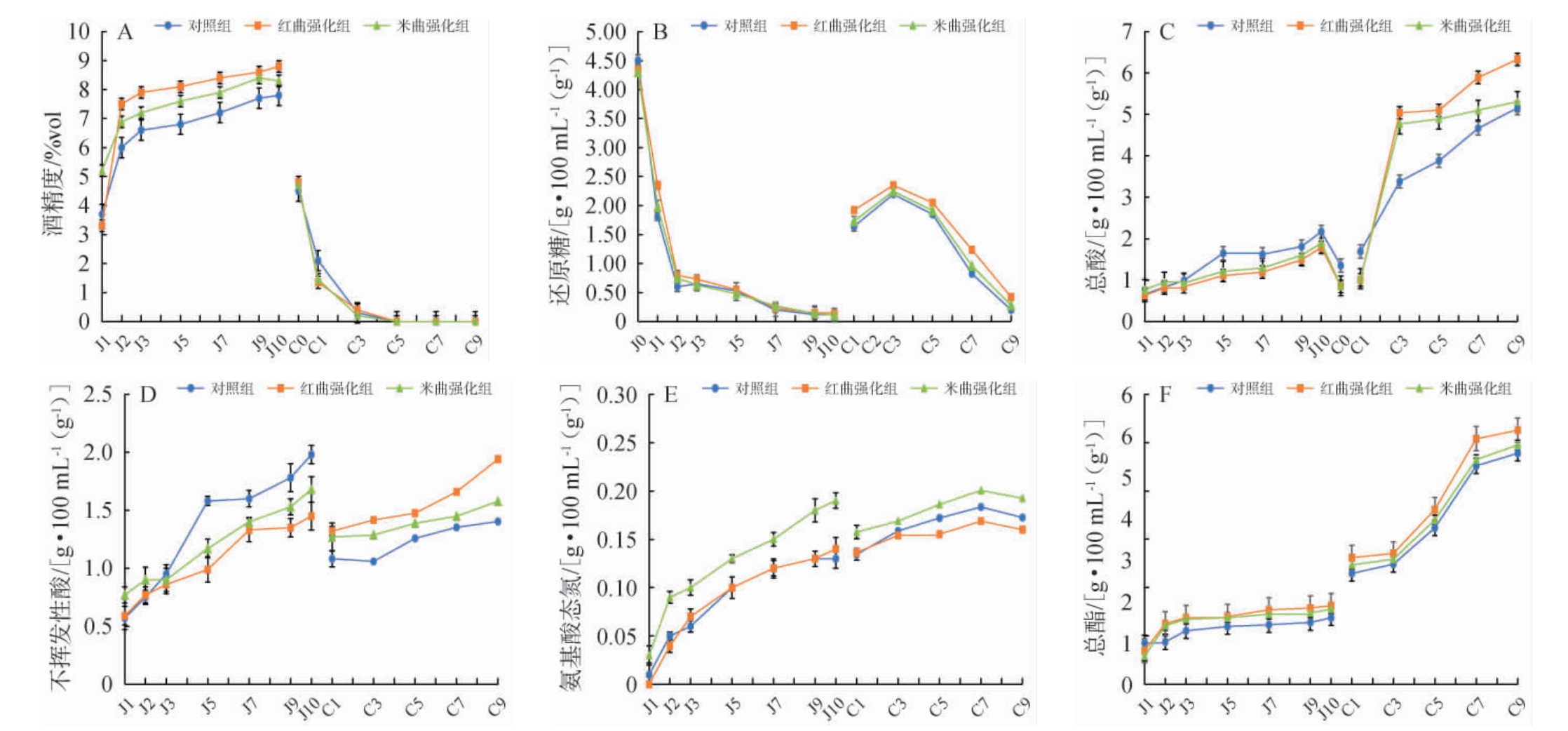 在酒精发酵阶段,总酸和不挥发性酸含量的变化趋势同步性较强,这是因为酒精发酵阶段产酸主要为乳酸,不挥发性酸在总酸中占比较高[15]。由图3C和图3D可知,各组在整个发酵过程中总酸和不挥发性酸均整体呈上升趋势。在醋酸发酵阶段,红曲强化组和米曲强化组的总酸和不挥发性酸含量整体明显高于对照组,这是由于红曲和米曲中含有多种微生物,通过糖酵解途径产生丙酮酸,丙酮酸在乳酸脱氢酶的作用下可以转化为乳酸,同时促进其他微生物产乙酸、柠檬酸等有机酸[3]。醋酸发酵结束时,红曲强化组和米曲强化组的总酸含量分别为6.33 g/100 mL、5.31 g/100 mL,较对照组分别提高了22.67%、2.90%;红曲强化组和米曲强化组的不挥发性酸含量分别为1.94 g/100 mL、1.58 g/100 mL,较对照组分别提高了38.57%、12.86%。总体来说,红曲强化组对总酸和不挥发性酸含量提高更明显。