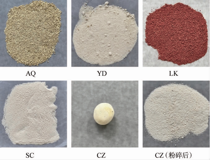 麦曲(AQ):安琪酵母股份有限公司;小曲(YD):湖南雅大智能科技有限公司;红曲(LK):丽水力克生物科技有限公司;米曲(SC):江西寿长微生物技术开发有限公司;小曲(CZ):湖北楚寨发酵制品有限公司;5种不同酒曲样品的形态见图1。糯红高粱:四川省泸州市合江县;黑糯米:黑龙江省绥化市。