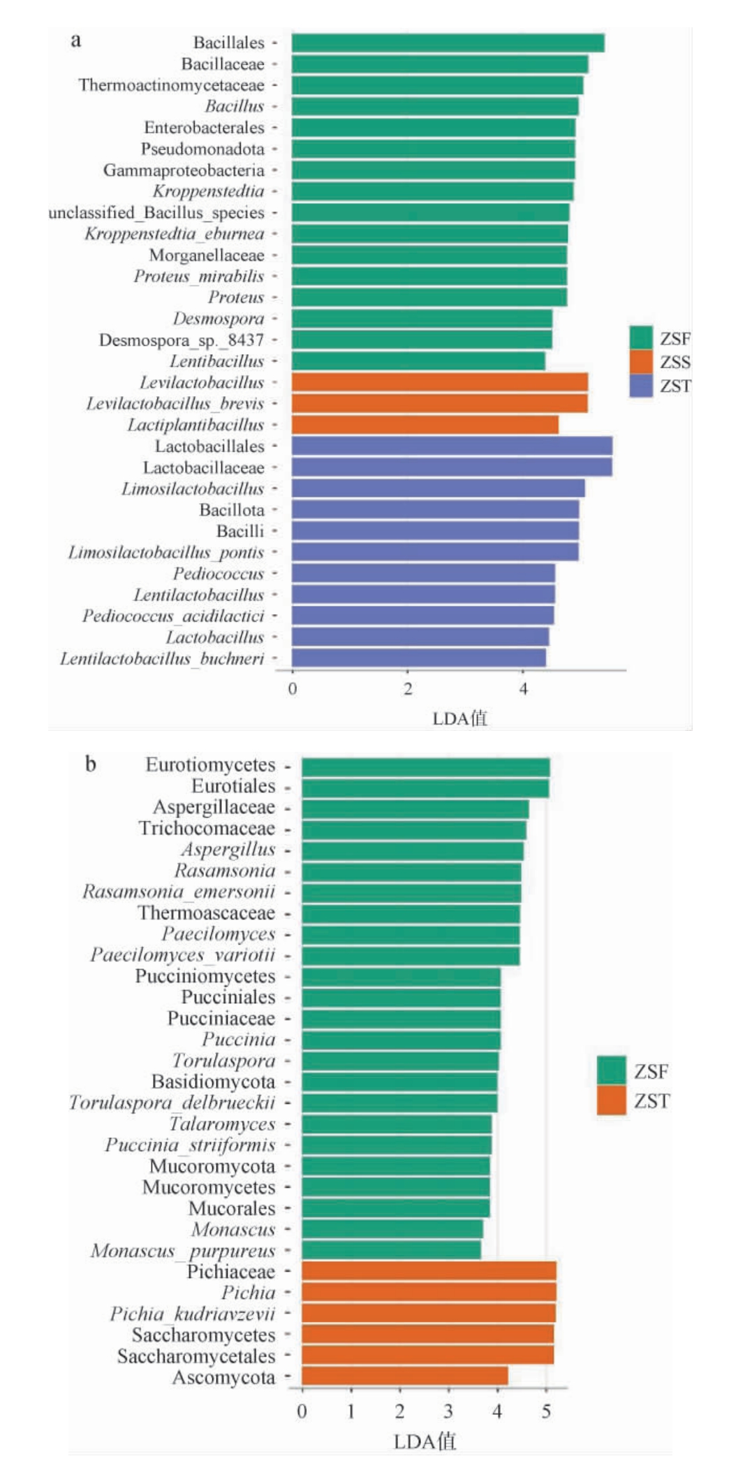 由图6(a)可知,细菌群落中筛选得到ZSF组主要差异细菌为芽孢杆菌目(Bacillales)、芽孢杆菌科(Bacillaceae),这些类群多为环境中常见的微生物;ZSS组主要差异细菌为发酵剂乳杆菌属(Levilactobacillus)、乳植杆菌属(Lactiplantibacillus),这表明乳酸菌群在堆积发酵第二天开始富集;ZST组主要差异细菌为乳酸杆菌目(Lactobacillales),乳杆菌科(Lactobacillaceae)、粘液乳杆菌属(Limosilactobacillus),这些菌的产生可能与发酵酒醅中酸度和温度逐渐升高有关。