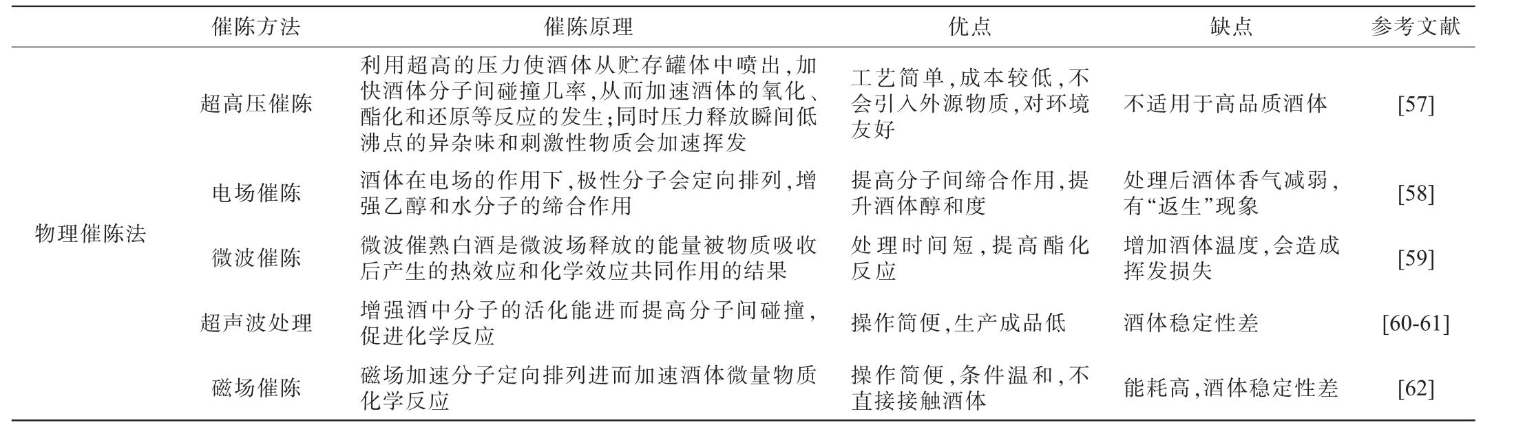 催陈方法 催陈原理 优点 缺点 参考文献超高压催陈不适用于高品质酒体[57]电场催陈[58]物理催陈法微波催陈[59]超声波处理处理后酒体香气减弱,有“返生”现象增加酒体温度,会造成挥发损失酒体稳定性差[60-61]磁场催陈利用超高的压力使酒体从贮存罐体中喷出,加快酒体分子间碰撞几率,从而加速酒体的氧化、酯化和还原等反应的发生;同时压力释放瞬间低沸点的异杂味和刺激性物质会加速挥发酒体在电场的作用下,极性分子会定向排列,增强乙醇和水分子的缔合作用微波催熟白酒是微波场释放的能量被物质吸收后产生的热效应和化学效应共同作用的结果增强酒中分子的活化能进而提高分子间碰撞,促进化学反应磁场加速分子定向排列进而加速酒体微量物质化学反应工艺简单,成本较低,不会引入外源物质,对环境友好提高分子间缔合作用,提升酒体醇和度处理时间短,提高酯化反应操作简便,生产成品低操作简便,条件温和,不直接接触酒体能耗高,酒体稳定性差[62]