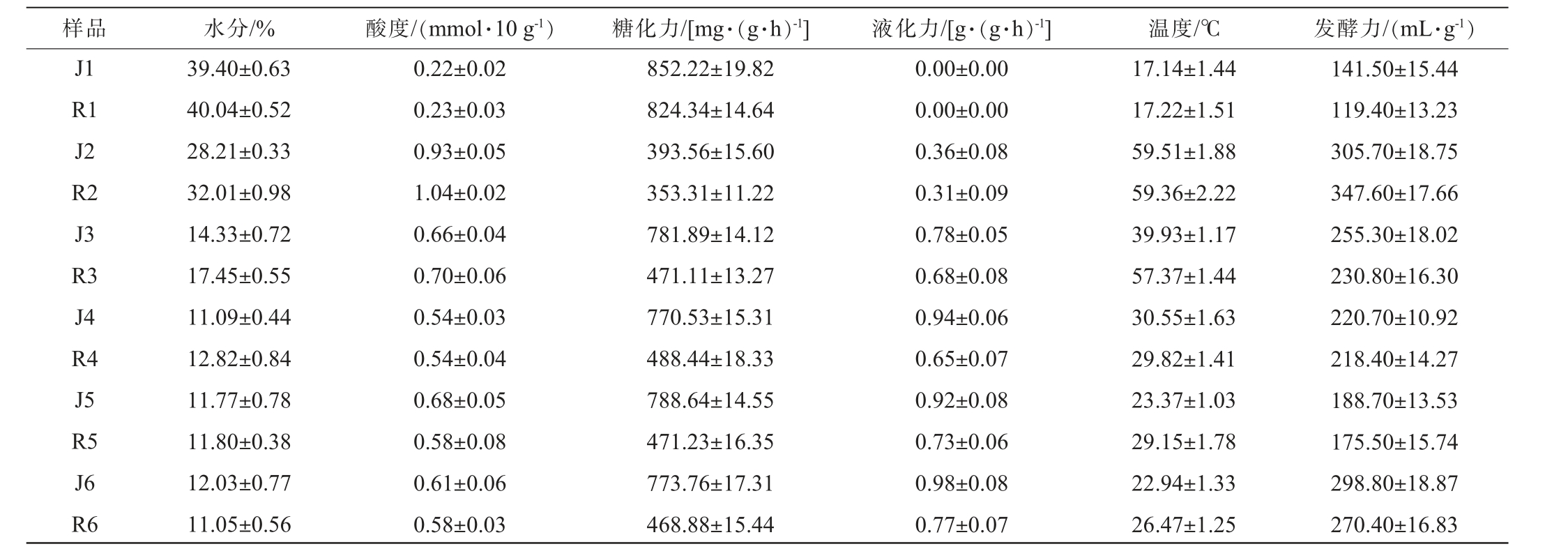 样品 水分/% 酸度/(mmol·10 g-1) 糖化力/[mg·(g·h)-1] 液化力/[g·(g·h)-1] 温度/℃ 发酵力/(mL·g-1)J1 R1 J2 R2 J3 R3 J4 R4 J5 R5 J6 R6 39.40±0.63 40.04±0.52 28.21±0.33 32.01±0.98 14.33±0.72 17.45±0.55 11.09±0.44 12.82±0.84 11.77±0.78 11.80±0.38 12.03±0.77 11.05±0.56 0.22±0.02 0.23±0.03 0.93±0.05 1.04±0.02 0.66±0.04 0.70±0.06 0.54±0.03 0.54±0.04 0.68±0.05 0.58±0.08 0.61±0.06 0.58±0.03 852.22±19.82 824.34±14.64 393.56±15.60 353.31±11.22 781.89±14.12 471.11±13.27 770.53±15.31 488.44±18.33 788.64±14.55 471.23±16.35 773.76±17.31 468.88±15.44 0.00±0.00 0.00±0.00 0.36±0.08 0.31±0.09 0.78±0.05 0.68±0.08 0.94±0.06 0.65±0.07 0.92±0.08 0.73±0.06 0.98±0.08 0.77±0.07 17.14±1.44 17.22±1.51 59.51±1.88 59.36±2.22 39.93±1.17 57.37±1.44 30.55±1.63 29.82±1.41 23.37±1.03 29.15±1.78 22.94±1.33 26.47±1.25 141.50±15.44 119.40±13.23 305.70±18.75 347.60±17.66 255.30±18.02 230.80±16.30 220.70±10.92 218.40±14.27 188.70±13.53 175.50±15.74 298.80±18.87 270.40±16.83