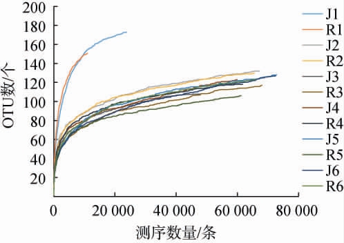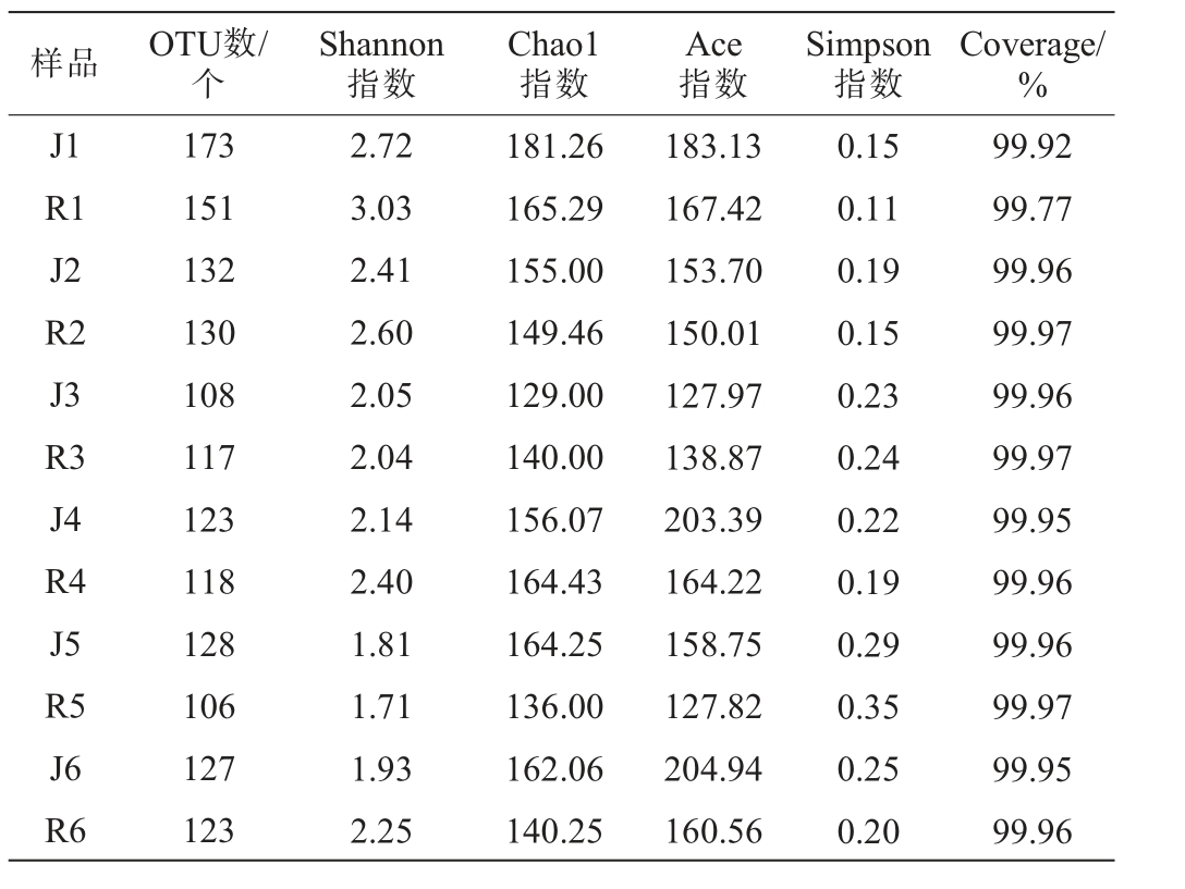 样品 OTU数/个Shannon指数Chao1指数Ace指数Simpson指数Coverage/%J1 R1 J2 R2 J3 R3 J4 R4 J5 R5 J6 R6 173 151 132 130 108 117 123 118 128 106 127 123 2.72 3.03 2.41 2.60 2.05 2.04 2.14 2.40 1.81 1.71 1.93 2.25 181.26 165.29 155.00 149.46 129.00 140.00 156.07 164.43 164.25 136.00 162.06 140.25 183.13 167.42 153.70 150.01 127.97 138.87 203.39 164.22 158.75 127.82 204.94 160.56 0.15 0.11 0.19 0.15 0.23 0.24 0.22 0.19 0.29 0.35 0.25 0.20 99.92 99.77 99.96 99.97 99.96 99.97 99.95 99.96 99.96 99.97 99.95 99.96