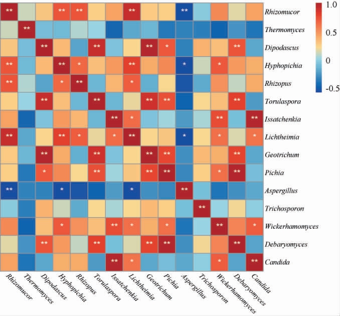 Fig.5 Results of correlation analysis between the fungal communities in medium-high temperature Daqu based on genus level
