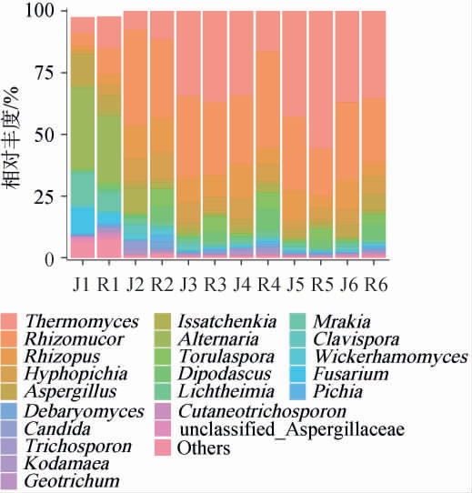 进一步在属水平上对不同工艺中高温大曲发酵过程中的真菌群落结构进行分析,结果见图3。由图3可知,刚入房时两种中高温大曲中的优势真菌属均为链格孢属(Alternaria)(J1为32.7%,R1为26.7%)、嗜热真菌属(Thermomyces)(J1为6.5%,R1为12.9%)、毛霉属(Rhizomucor)(J1为5.2%,R1为10.5%)、木拉克属(Mrakia)(J1为12.6%,R1为7.3%)、曲霉属(Aspergillus)(J1为12.6%,R1为6.3%)、根霉属(Rhizopus)(J1为1.9%,R1为4.3%)、丝孢毕赤酵母属(Hyphopichia)(J1为1.3%,R1为4.1%)、镰刀菌属(Fusarium)(J1为10.3%,R1为3.7%)、伊萨酵母属(Issatchenkia)(J1为1.1%,R1为2.3%)。伴随发酵进行,发酵环境迅速改变,大曲微生物群落结构开始演替,发酵14 d时整个菌群达到相对稳定的状态,出房时两种中高温大曲中的优势真菌属均为嗜热真菌属(J6为36.9%,R6为35.3%)、毛霉属(J6为31.3%,R6为26.1%)、丝孢毕赤酵母属(J6为6.2%,R6为7.5%)、曲霉属(Aspergillus)(J6为4.8%,R6为6.3%)、双足囊菌属(Dipodascus)(J6为0.3%,R6为6.3%)、根霉属(J6为12.1%,R6为5.4%)、孢圆酵母属(Torulaspora)(J6为0.6%,R6为4.1%)、横梗霉属(Lichtheimia)(J6为1.8%,R6为1.4%)。