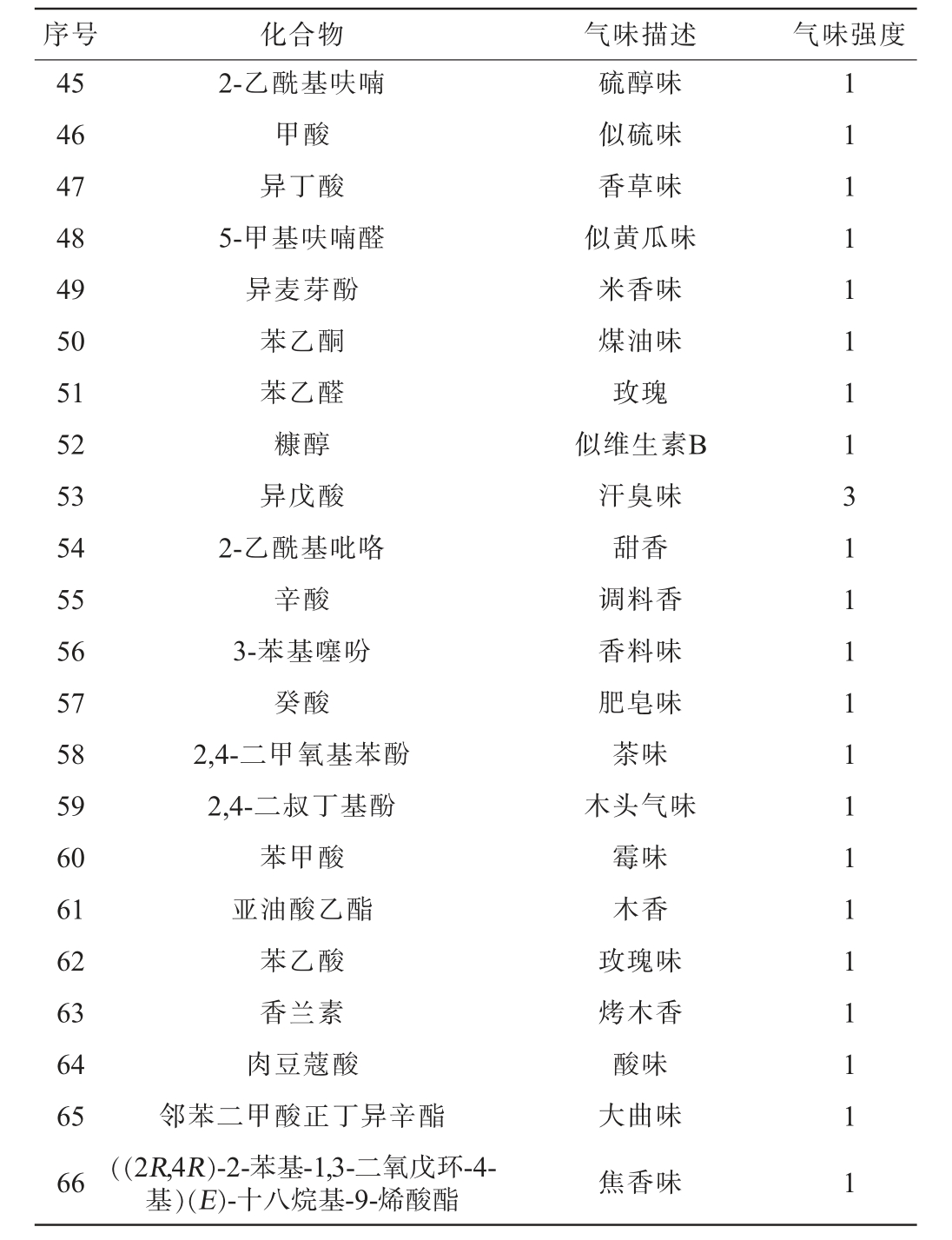 序号 化合物 气味描述 气味强度45 46 47 48 49 50 51 52 53 54 55 56 57 58 59 60 61 62 63 64 65 66 2-乙酰基呋喃甲酸异丁酸5-甲基呋喃醛异麦芽酚苯乙酮苯乙醛糠醇异戊酸2-乙酰基吡咯辛酸3-苯基噻吩癸酸2,4-二甲氧基苯酚2,4-二叔丁基酚苯甲酸亚油酸乙酯苯乙酸香兰素肉豆蔻酸邻苯二甲酸正丁异辛酯((2R,4R)-2-苯基-1,3-二氧戊环-4-基)(E)-十八烷基-9-烯酸酯硫醇味似硫味香草味似黄瓜味米香味煤油味玫瑰似维生素B汗臭味甜香调料香香料味肥皂味茶味木头气味霉味木香玫瑰味烤木香酸味大曲味焦香味1 1 1 1 1 1 1 1 3 1 1 1 1 1 1 1 1 1 1 1 1 1