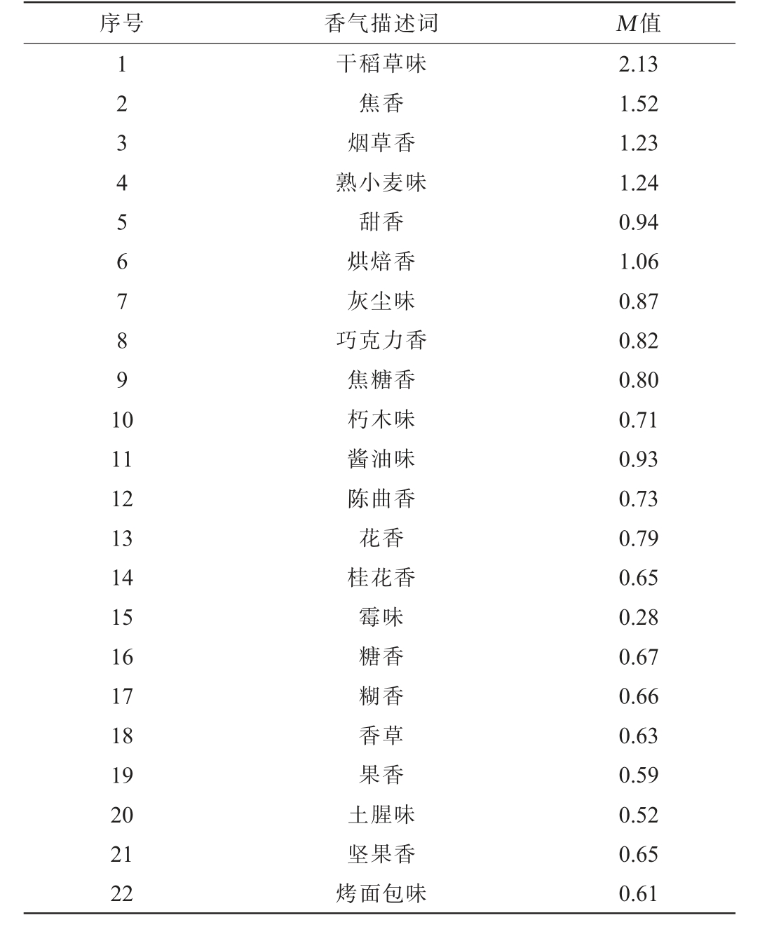 序号 香气描述词 M 值1234567891 0 11 12 13 14 15 16 17 18 19 20 21 22干稻草味焦香烟草香熟小麦味甜香烘焙香灰尘味巧克力香焦糖香朽木味酱油味陈曲香花香桂花香霉味糖香糊香香草果香土腥味坚果香烤面包味2.13 1.52 1.23 1.24 0.94 1.06 0.87 0.82 0.80 0.71 0.93 0.73 0.79 0.65 0.28 0.67 0.66 0.63 0.59 0.52 0.65 0.61