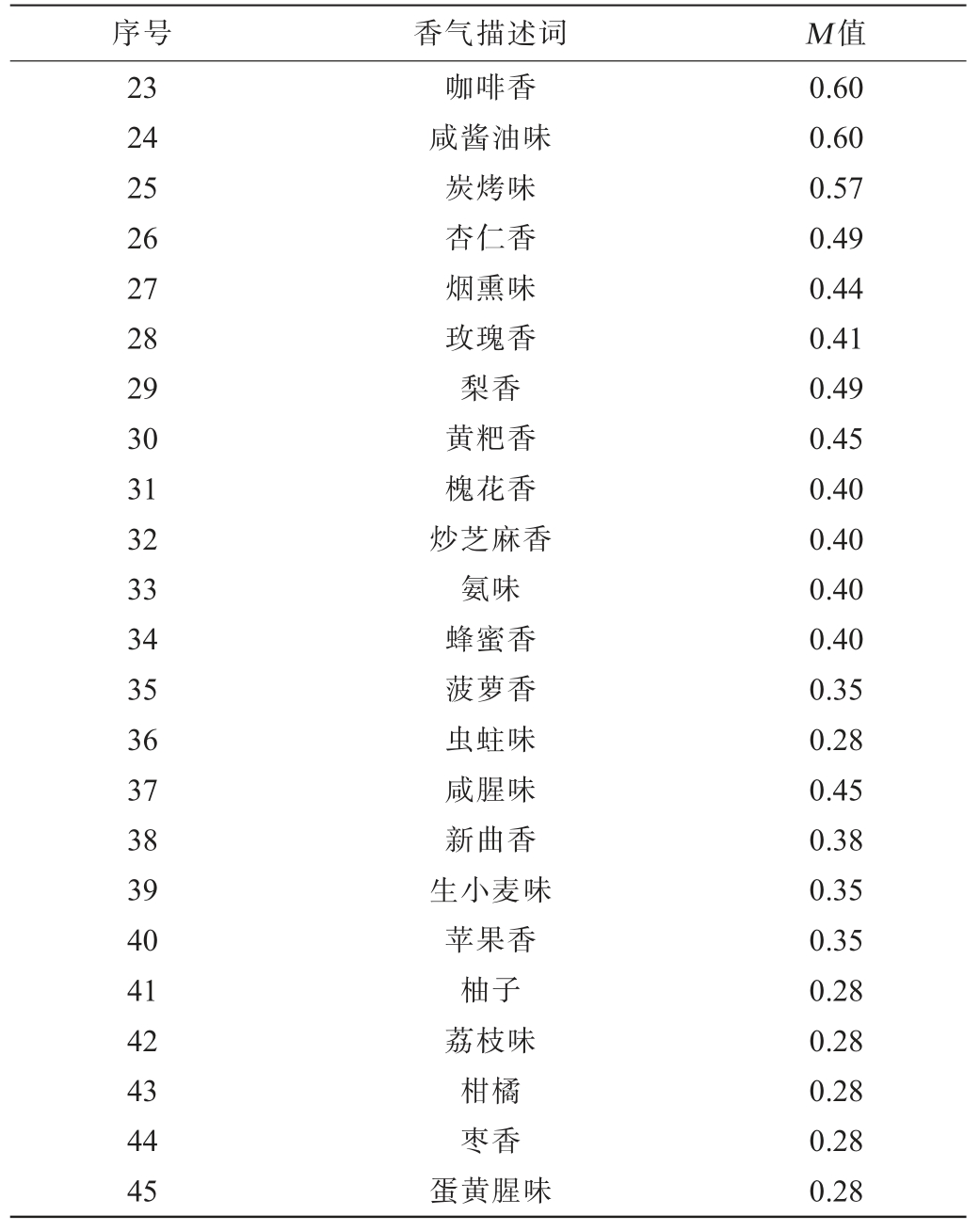 序号 香气描述词 M 值23 24 25 26 27 28 29 30 31 32 33 34 35 36 37 38 39 40 41 42 43 44 45咖啡香咸酱油味炭烤味杏仁香烟熏味玫瑰香梨香黄粑香槐花香炒芝麻香氨味蜂蜜香菠萝香虫蛀味咸腥味新曲香生小麦味苹果香柚子荔枝味柑橘枣香蛋黄腥味0.60 0.60 0.57 0.49 0.44 0.41 0.49 0.45 0.40 0.40 0.40 0.40 0.35 0.28 0.45 0.38 0.35 0.35 0.28 0.28 0.28 0.28 0.28