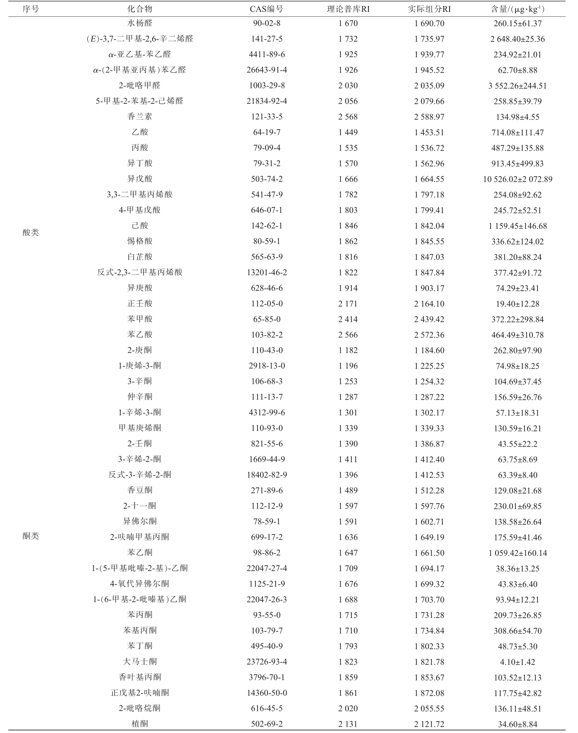 序号 化合物 CAS编号 理论普库RI 实际组分RI 含量/(μg·kg-1)酸类酮类水杨醛(E)-3,7-二甲基-2,6-辛二烯醛α-亚乙基-苯乙醛α-(2-甲基亚丙基)苯乙醛2-吡咯甲醛5-甲基-2-苯基-2-己烯醛香兰素乙酸丙酸异丁酸异戊酸3,3-二甲基丙烯酸4-甲基戊酸己酸惕格酸白芷酸反式-2,3-二甲基丙烯酸异庚酸正壬酸苯甲酸苯乙酸2-庚酮1-庚烯-3-酮3-辛酮仲辛酮1-辛烯-3-酮甲基庚烯酮2-壬酮3-辛烯-2-酮反式-3-辛烯-2-酮香豆酮2-十一酮异佛尔酮2-呋喃甲基丙酮苯乙酮1-(5-甲基吡嗪-2-基)-乙酮4-氧代异佛尔酮1-(6-甲基-2-吡嗪基)乙酮苯丙酮苯基丙酮苯丁酮大马士酮香叶基丙酮正戊基2-呋喃酮2-吡咯烷酮植酮90-02-8 141-27-5 4411-89-6 26643-91-4 1003-29-8 21834-92-4 121-33-5 64-19-7 79-09-4 79-31-2 503-74-2 541-47-9 646-07-1 142-62-1 80-59-1 565-63-9 13201-46-2 628-46-6 112-05-0 65-85-0 103-82-2 110-43-0 2918-13-0 106-68-3 111-13-7 4312-99-6 110-93-0 821-55-6 1669-44-9 18402-82-9 271-89-6 112-12-9 78-59-1 699-17-2 98-86-2 22047-27-4 1125-21-9 22047-26-3 93-55-0 103-79-7 495-40-9 23726-93-4 3796-70-1 14360-50-0 616-45-5 502-69-2 1 670 1 732 1 925 1 926 2 030 2 056 2 568 1 449 1 535 1 570 1 666 1 782 1 803 1 846 1 862 1 816 1 822 1 914 2 171 2 414 2 566 1 182 1 196 1 253 1 287 1 301 1 339 1 390 1 411 1 396 1 489 1 597 1 591 1 636 1 647 1 709 1 676 1 688 1 715 1 710 1 793 1 823 1 859 1 861 2 020 2 131 1 690.70 1 735.97 1 939.77 1 945.52 2 035.09 2 079.66 2 588.97 1 453.51 1 536.72 1 562.96 1 664.55 1 797.18 1 799.41 1 842.04 1 845.55 1 847.03 1 847.84 1 903.17 2 164.10 2 439.42 2 572.36 1 184.60 1 225.25 1 254.32 1 287.22 1 302.17 1 339.33 1 386.87 1 412.40 1 412.53 1 512.28 1 597.76 1 602.71 1 649.19 1 661.50 1 694.17 1 699.32 1 703.70 1 731.28 1 734.84 1 802.33 1 821.78 1 853.67 1 872.08 2 055.55 2 121.72 260.15±61.37 2 648.40±25.36 234.92±21.01 62.70±8.88 3 552.26±244.51 258.85±39.79 134.98±4.55 714.08±111.47 487.29±135.88 913.45±499.83 10 526.02±2 072.89 254.08±92.62 245.72±52.51 1 159.45±146.68 336.62±124.02 381.20±88.24 377.42±91.72 74.29±23.41 19.40±12.28 372.22±298.84 464.49±310.78 262.80±97.90 74.98±18.25 104.69±37.45 156.59±26.76 57.13±18.31 130.59±16.21 43.55±22.2 63.75±8.69 63.39±8.40 129.08±21.68 230.01±69.85 138.58±26.64 175.59±41.46 1 059.42±160.14 38.36±13.25 43.83±6.40 93.94±12.21 209.73±26.85 308.66±54.70 48.73±5.30 4.10±1.42 103.52±12.13 117.75±42.82 136.11±48.51 34.60±8.84