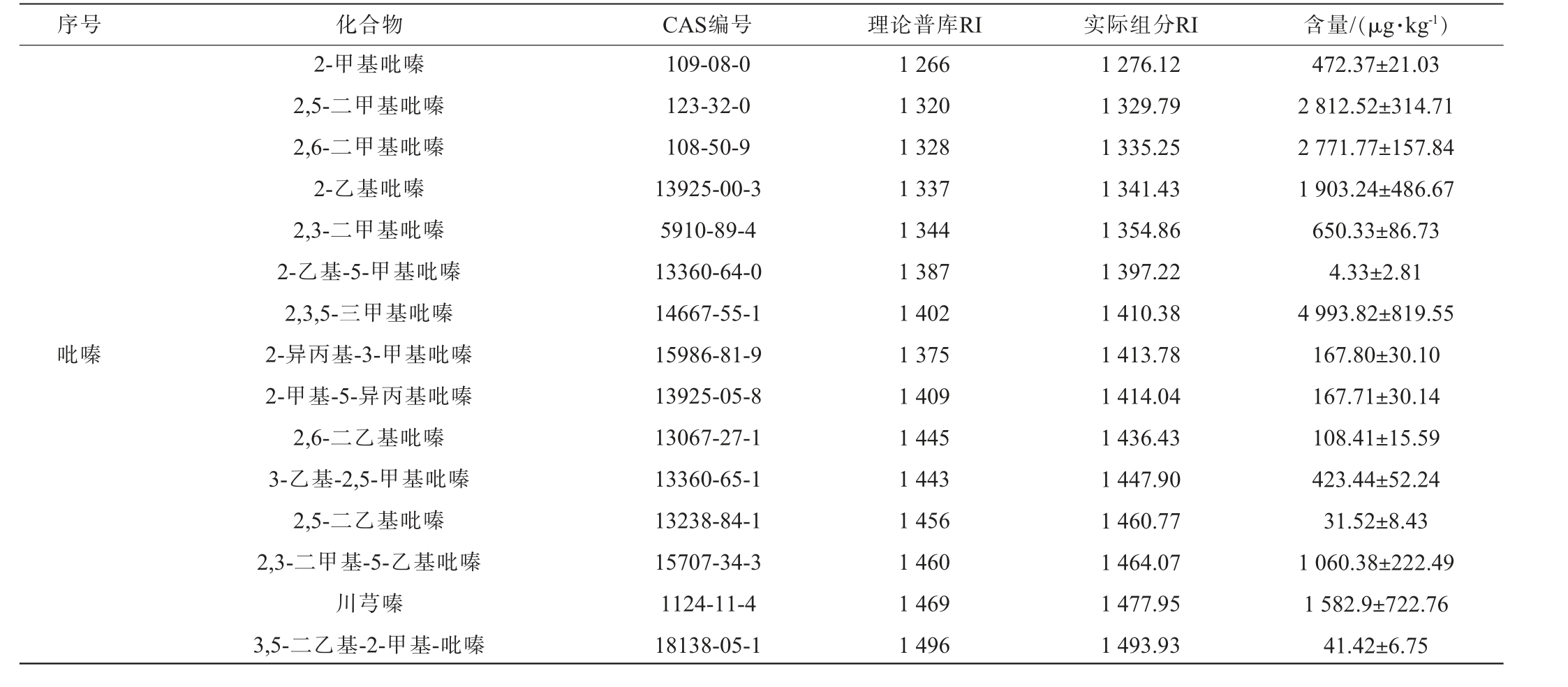序号 化合物 CAS编号 理论普库RI 实际组分RI 含量/(μg·kg-1)吡嗪2-甲基吡嗪2,5-二甲基吡嗪2,6-二甲基吡嗪2-乙基吡嗪2,3-二甲基吡嗪2-乙基-5-甲基吡嗪2,3,5-三甲基吡嗪2-异丙基-3-甲基吡嗪2-甲基-5-异丙基吡嗪2,6-二乙基吡嗪3-乙基-2,5-甲基吡嗪2,5-二乙基吡嗪2,3-二甲基-5-乙基吡嗪川芎嗪3,5-二乙基-2-甲基-吡嗪109-08-0 123-32-0 108-50-9 13925-00-3 5910-89-4 13360-64-0 14667-55-1 15986-81-9 13925-05-8 13067-27-1 13360-65-1 13238-84-1 15707-34-3 1124-11-4 18138-05-1 1 266 1 320 1 328 1 337 1 344 1 387 1 402 1 375 1 409 1 445 1 443 1 456 1 460 1 469 1 496 1 276.12 1 329.79 1 335.25 1 341.43 1 354.86 1 397.22 1 410.38 1 413.78 1 414.04 1 436.43 1 447.90 1 460.77 1 464.07 1 477.95 1 493.93 472.37±21.03 2 812.52±314.71 2 771.77±157.84 1 903.24±486.67 650.33±86.73 4.33±2.81 4 993.82±819.55 167.80±30.10 167.71±30.14 108.41±15.59 423.44±52.24 31.52±8.43 1 060.38±222.49 1 582.9±722.76 41.42±6.75