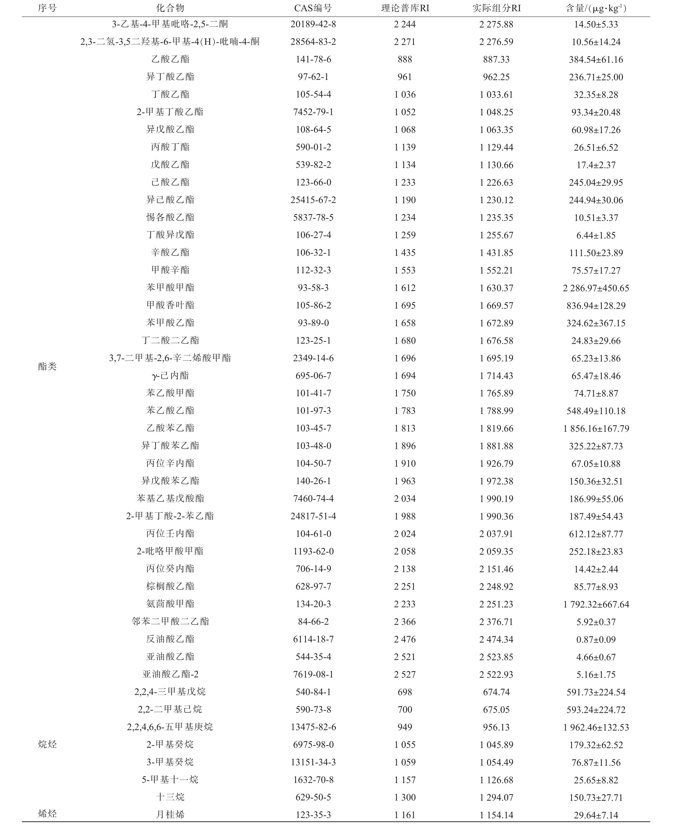 序号 化合物 CAS编号 理论普库RI 实际组分RI 含量/(μg·kg-1)3-乙基-4-甲基吡咯-2,5-二酮2,3-二氢-3,5二羟基-6-甲基-4(H)-吡喃-4-酮酯类烷烃烯烃乙酸乙酯异丁酸乙酯丁酸乙酯2-甲基丁酸乙酯异戊酸乙酯丙酸丁酯戊酸乙酯己酸乙酯异己酸乙酯惕各酸乙酯丁酸异戊酯辛酸乙酯甲酸辛酯苯甲酸甲酯甲酸香叶酯苯甲酸乙酯丁二酸二乙酯3,7-二甲基-2,6-辛二烯酸甲酯γ-己内酯苯乙酸甲酯苯乙酸乙酯乙酸苯乙酯异丁酸苯乙酯丙位辛内酯异戊酸苯乙酯苯基乙基戊酸酯2-甲基丁酸-2-苯乙酯丙位壬内酯2-吡咯甲酸甲酯丙位癸内酯棕榈酸乙酯氨茴酸甲酯邻苯二甲酸二乙酯反油酸乙酯亚油酸乙酯亚油酸乙酯-2 2,2,4-三甲基戊烷2,2-二甲基己烷2,2,4,6,6-五甲基庚烷2-甲基癸烷3-甲基癸烷5-甲基十一烷十三烷月桂烯20189-42-8 28564-83-2 141-78-6 97-62-1 105-54-4 7452-79-1 108-64-5 590-01-2 539-82-2 123-66-0 25415-67-2 5837-78-5 106-27-4 106-32-1 112-32-3 93-58-3 105-86-2 93-89-0 123-25-1 2349-14-6 695-06-7 101-41-7 101-97-3 103-45-7 103-48-0 104-50-7 140-26-1 7460-74-4 24817-51-4 104-61-0 1193-62-0 706-14-9 628-97-7 134-20-3 84-66-2 6114-18-7 544-35-4 7619-08-1 540-84-1 590-73-8 13475-82-6 6975-98-0 13151-34-3 1632-70-8 629-50-5 123-35-3 2 244 2 271 888 961 1 036 1 052 1 068 1 139 1 134 1 233 1 190 1 234 1 259 1 435 1 553 1 612 1 695 1 658 1 680 1 696 1 694 1 750 1 783 1 813 1 896 1 910 1 963 2 034 1 988 2 024 2 058 2 138 2 251 2 233 2 366 2 476 2 521 2 527 698 700 949 1 055 1 059 1 157 1 300 1 161 2 275.88 2 276.59 887.33 962.25 1 033.61 1 048.25 1 063.35 1 129.44 1 130.66 1 226.63 1 230.12 1 235.35 1 255.67 1 431.85 1 552.21 1 630.37 1 669.57 1 672.89 1 676.58 1 695.19 1 714.43 1 765.89 1 788.99 1 819.66 1 881.88 1 926.79 1 972.38 1 990.19 1 990.36 2 037.91 2 059.35 2 151.46 2 248.92 2 251.23 2 376.71 2 474.34 2 523.85 2 522.93 674.74 675.05 956.13 1 045.89 1 054.49 1 126.68 1 294.07 1 154.14 14.50±5.33 10.56±14.24 384.54±61.16 236.71±25.00 32.35±8.28 93.34±20.48 60.98±17.26 26.51±6.52 17.4±2.37 245.04±29.95 244.94±30.06 10.51±3.37 6.44±1.85 111.50±23.89 75.57±17.27 2 286.97±450.65 836.94±128.29 324.62±367.15 24.83±29.66 65.23±13.86 65.47±18.46 74.71±8.87 548.49±110.18 1 856.16±167.79 325.22±87.73 67.05±10.88 150.36±32.51 186.99±55.06 187.49±54.43 612.12±87.77 252.18±23.83 14.42±2.44 85.77±8.93 1 792.32±667.64 5.92±0.37 0.87±0.09 4.66±0.67 5.16±1.75 591.73±224.54 593.24±224.72 1 962.46±132.53 179.32±62.52 76.87±11.56 25.65±8.82 150.73±27.71 29.64±7.14