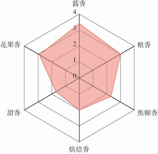根据描述词的M值计算结果(M值>0.4)结合品评小组的讨论,最终选取酱香、粮香、焦糊味、烘焙香、花果香和甜香6个感官属性进行金沙产区高温大曲不同等级感官定量描述分析,根据结果绘制风味雷达图。 随机选择一个金沙产区高温大曲样品,根据6个感官属性对金沙产区高温大曲样品进行感官评价,并对强度进行打分,绘制金沙产区高温大曲风味雷达图,结果见图2。