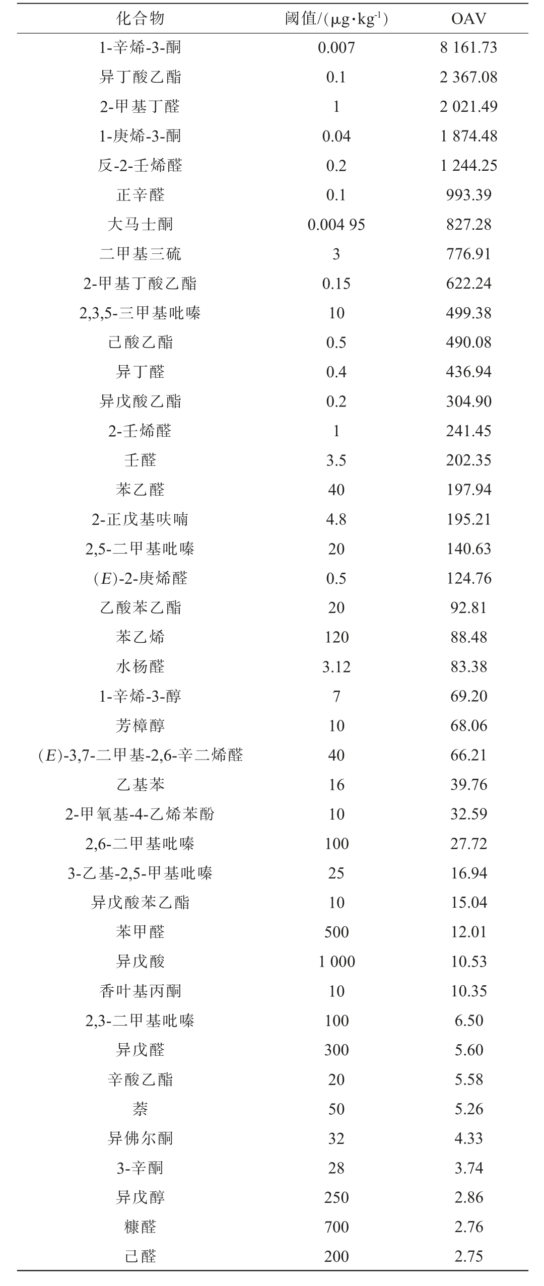 化合物 阈值/(μg·kg-1) OAV 1-辛烯-3-酮异丁酸乙酯2-甲基丁醛1-庚烯-3-酮反-2-壬烯醛正辛醛大马士酮二甲基三硫2-甲基丁酸乙酯2,3,5-三甲基吡嗪己酸乙酯异丁醛异戊酸乙酯2-壬烯醛壬醛苯乙醛2-正戊基呋喃2,5-二甲基吡嗪(E)-2-庚烯醛乙酸苯乙酯苯乙烯水杨醛1-辛烯-3-醇芳樟醇(E)-3,7-二甲基-2,6-辛二烯醛乙基苯2-甲氧基-4-乙烯苯酚2,6-二甲基吡嗪3-乙基-2,5-甲基吡嗪异戊酸苯乙酯苯甲醛异戊酸香叶基丙酮2,3-二甲基吡嗪异戊醛辛酸乙酯萘异佛尔酮3-辛酮异戊醇糠醛己醛0.007 0.1 1 0.04 0.2 0.1 0.004 95 3 0.15 10 0.5 0.4 0.2 1 3.5 40 4.8 20 0.5 20 120 3.12 7 10 40 16 10 100 25 10 500 1 000 10 100 300 20 50 32 28 250 700 200 8 161.73 2 367.08 2 021.49 1 874.48 1 244.25 993.39 827.28 776.91 622.24 499.38 490.08 436.94 304.90 241.45 202.35 197.94 195.21 140.63 124.76 92.81 88.48 83.38 69.20 68.06 66.21 39.76 32.59 27.72 16.94 15.04 12.01 10.53 10.35 6.50 5.60 5.58 5.26 4.33 3.74 2.86 2.76 2.75