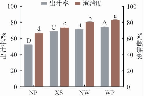 在澄清度方面,未添加果胶酶的NP组为(66.59±1.14)%,而WP处理组的果汁澄清度达到(83.16±0.58)%,显著高于XS组(73.44±1.01)%和NW组(80.23±1.01)%(P<0.05),比未添加果胶酶的对照组高出16.57%。
