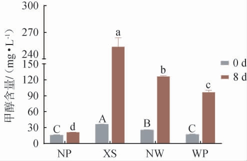 蜜柑果汁和蜜柑果酒的甲醇含量测定结果见图3。 由图3可知,蜜柑果汁经过果胶酶酶解后(0 d),甲醇含量显著上升(P<0.05)。未发酵时,未添加果胶酶的NP组果汁甲醇含量为(15.50±0.99)mg/L,而经过果胶酶处理的果汁甲醇含量均显著增加(P<0.05),这与ZHANG H等[34]的研究结果一致。其中,WP处理的果汁甲醇含量为(16.85±0.92)mg/L,显著低于XS组[(35.85±0.64)mg/L]和NW组[(25.20±0.57)mg/L](P<0.05),分别降低了53.00%和33.13%的甲醇生成,表明低果胶酯酶活性的WP果胶酶能够有效降低甲醇的生成。