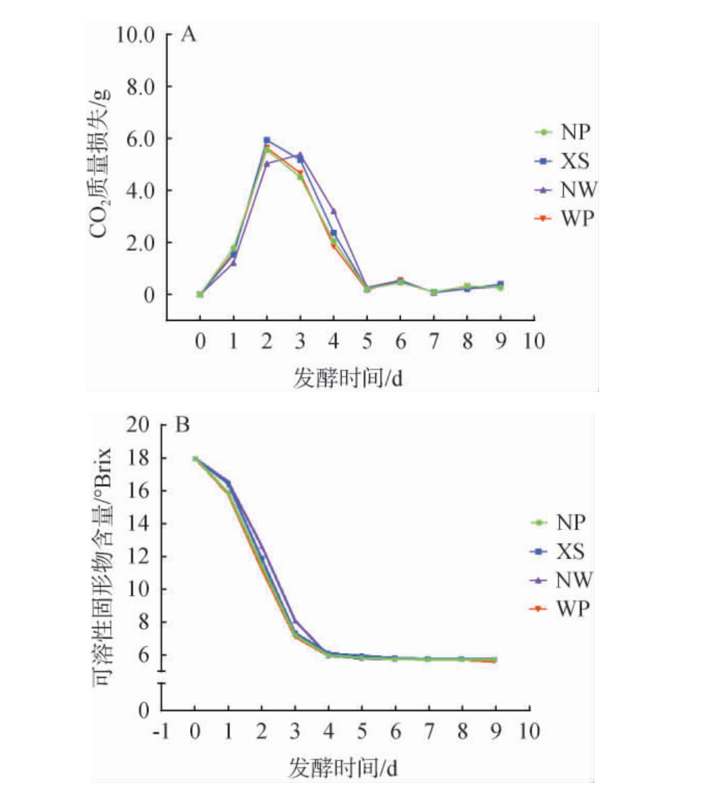 CO2质量损失与发酵过程中酵母代谢产气量相关,能够间接反映发酵活跃程度。 与未添加果胶酶的NP组相比,发酵组中添加果胶酶的XS和NW组的CO2质量损失更高,表明果胶酶处理会促进底物的释放,提高酵母发酵代谢的强度,进而导致CO2质量损失增加[32]。