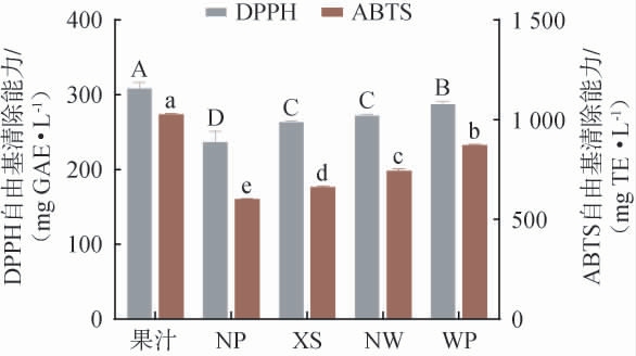 蜜柑果汁及其果酒的DPPH自由基及ABTS自由基清除能力测定结果见图5。