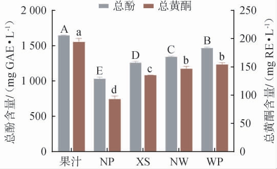 蜜柑果汁和四种蜜柑果酒的总酚和总黄酮含量测定结果见图4。由图4可知,蜜柑果酒中的总酚和总黄酮含量较果汁显著降低(P<0.05),这一发现与QI Y M等[36]的研究结果相一致。具体而言,蜜柑果酒的总酚含量在1 029.80~1 465.01 mg GAE/L范围内,其中WP处理组的总酚含量最高[(1 465.01±16.10)mg GAE/L],显著高于NP组[(1 029.80±25.18)mg GAE/L]、XS组[(1 256.73±19.21) mg GAE/L]和NW组[(1 341.64±10.66)mg GAE/L](P<0.05)。类似地,果酒中的总黄酮含量在92.78~153.95 mg GAE/L之间,其中WP处理组[(153.95±3.34)mg GAE/L]同样表现出最高的黄酮含量。 结果表明,经果胶酶处理的果酒其总酚和总黄酮含量均显著高于未酶解组(NP),这一现象可能归因于果胶酶能够更有效破坏果肉组织结构,从而促进细胞壁中类黄酮的释放[37]。果胶酶处理能够通过分解果胶物质,将聚合态多酚转化为生物可利用性更高的游离态多酚[38]。