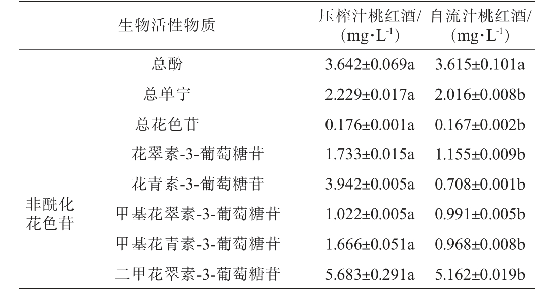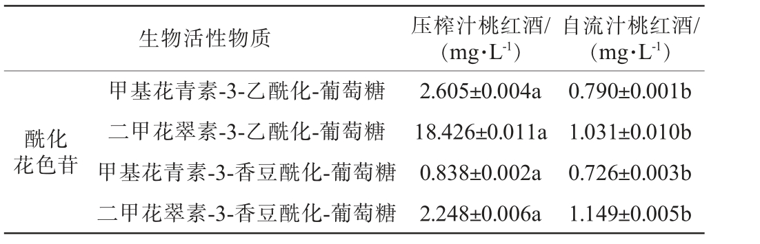 生物活性物质 压榨汁桃红酒/(mg·L-1)自流汁桃红酒/(mg·L-1)酰化花色苷甲基花青素-3-乙酰化-葡萄糖二甲花翠素-3-乙酰化-葡萄糖甲基花青素-3-香豆酰化-葡萄糖二甲花翠素-3-香豆酰化-葡萄糖2.605±0.004a 18.426±0.011a 0.838±0.002a 2.248±0.006a 0.790±0.001b 1.031±0.010b 0.726±0.003b 1.149±0.005b