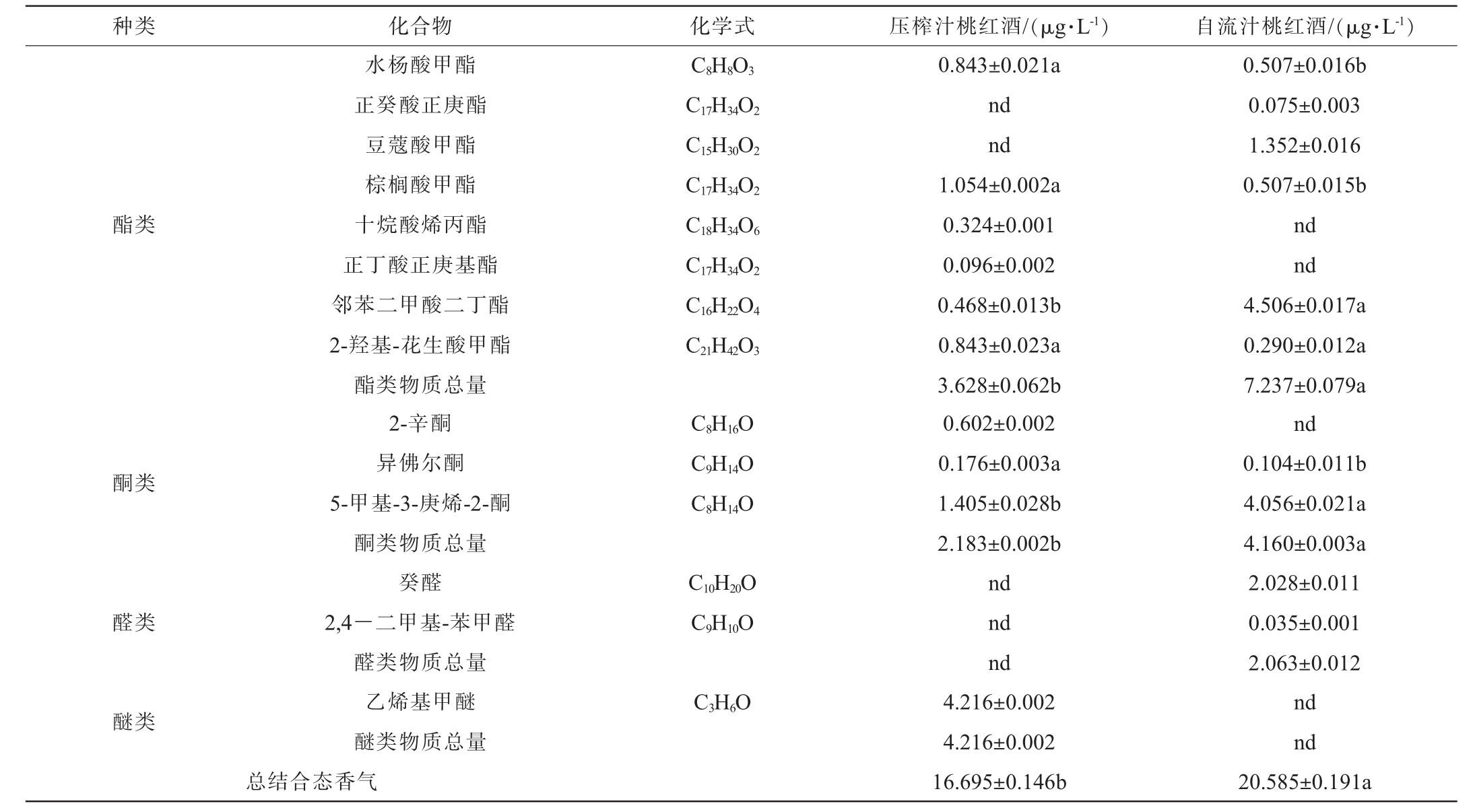 种类 化合物 化学式 压榨汁桃红酒/(μg·L-1) 自流汁桃红酒/(μg·L-1)C8H8O3酯类C17H34O2 C15H30O2 C17H34O2 C18H34O6 C17H34O2 C16H22O4 C21H42O3酮类C8H16O C9H14O C8H14O醛类C10H20O C9H10O醚类水杨酸甲酯正癸酸正庚酯豆蔻酸甲酯棕榈酸甲酯十烷酸烯丙酯正丁酸正庚基酯邻苯二甲酸二丁酯2-羟基-花生酸甲酯酯类物质总量2-辛酮异佛尔酮5-甲基-3-庚烯-2-酮酮类物质总量癸醛2,4—二甲基-苯甲醛醛类物质总量乙烯基甲醚醚类物质总量C3H6O总结合态香气0.843±0.021a nd nd 1.054±0.002a 0.324±0.001 0.096±0.002 0.468±0.013b 0.843±0.023a 3.628±0.062b 0.602±0.002 0.176±0.003a 1.405±0.028b 2.183±0.002b nd nd nd 4.216±0.002 4.216±0.002 16.695±0.146b 0.507±0.016b 0.075±0.003 1.352±0.016 0.507±0.015b nd nd 4.506±0.017a 0.290±0.012a 7.237±0.079a nd 0.104±0.011b 4.056±0.021a 4.160±0.003a 2.028±0.011 0.035±0.001 2.063±0.012 nd nd 20.585±0.191a