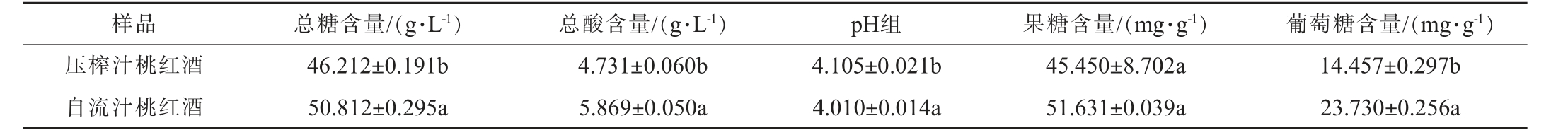 样品 总糖含量/(g·L-1) 总酸含量/(g·L-1) pH组 果糖含量/(mg·g-1) 葡萄糖含量/(mg·g-1)压榨汁桃红酒自流汁桃红酒46.212±0.191b 50.812±0.295a 4.731±0.060b 5.869±0.050a 4.105±0.021b 4.010±0.014a 45.450±8.702a 51.631±0.039a 14.457±0.297b 23.730±0.256a