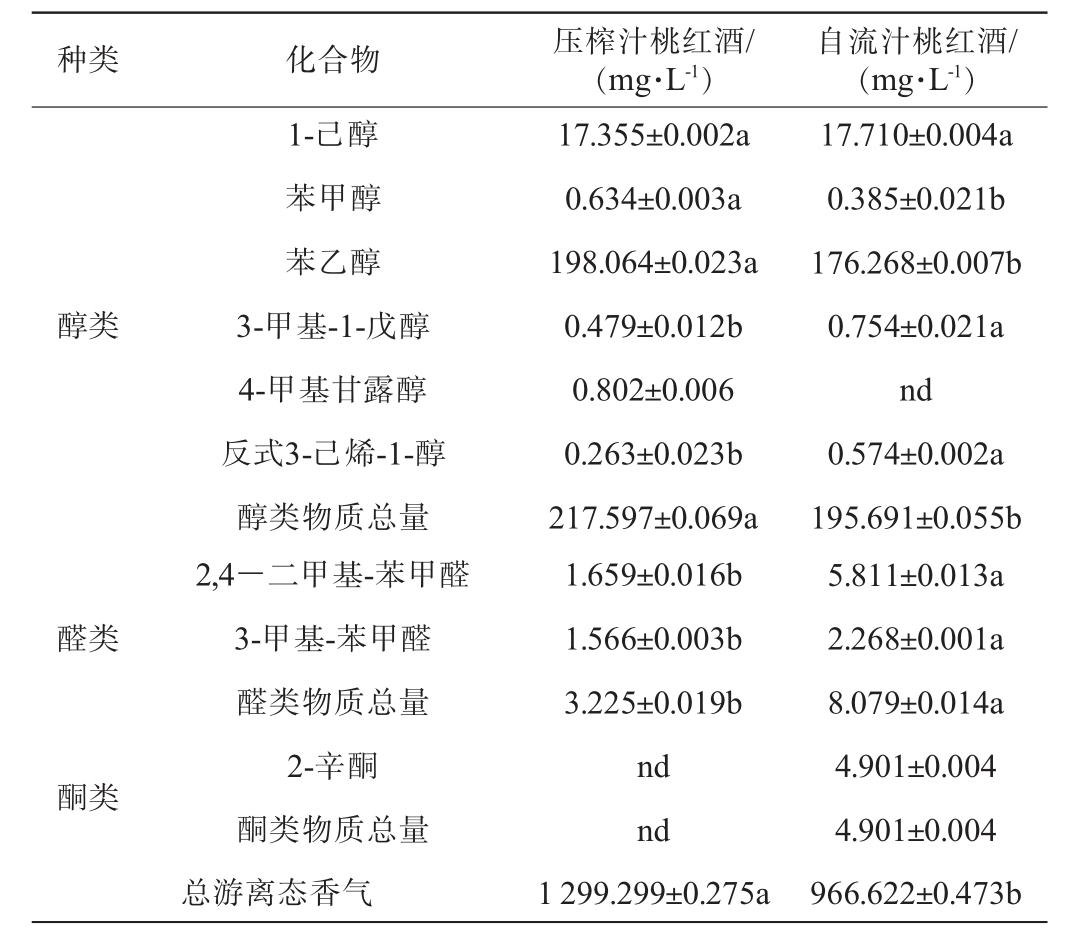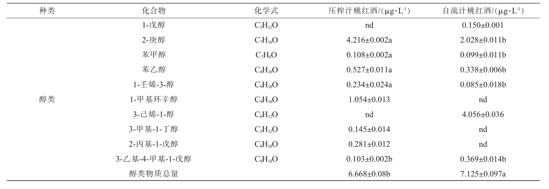 种类 化合物 化学式 压榨汁桃红酒/(μg·L-1) 自流汁桃红酒/(μg·L-1)醇类1-戊醇2-庚醇苯甲醇苯乙醇1-壬烯-3-醇1-甲基环辛醇3-己烯-1-醇3-甲基-1-丁醇2-丙基-1-戊醇3-乙基-4-甲基-1-戊醇醇类物质总量C5H12O C7H16O C7H8O C8H10O C9H18O C9H18O C6H12O C5H12O C8H18O C8H18O nd 4.216±0.002a 0.108±0.002a 0.527±0.011a 0.234±0.024a 1.054±0.013 nd 0.145±0.014 0.281±0.012 0.103±0.002b 6.668±0.08b 0.150±0.001 2.028±0.011b 0.099±0.011b 0.338±0.006b 0.085±0.018b nd 4.056±0.036 nd nd 0.369±0.014b 7.125±0.097a