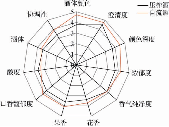 Fig.1 Sensory score radar chart of 'Cabernet Sauvignon' rose wine of pressed juice and free run juice
