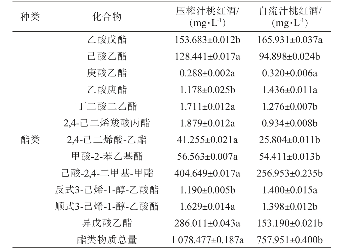 种类 化合物 压榨汁桃红酒/(mg·L-1)自流汁桃红酒/(mg·L-1)酯类乙酸戊酯己酸乙酯庚酸乙酯乙酸庚酯丁二酸二乙酯2,4-己二烯羧酸丙酯2,4-己二烯酸-乙酯甲酸-2-苯乙基酯己酸-2,4-二甲基-甲酯反式3-己烯-1-醇-乙酸酯顺式3-己烯-1-醇-乙酸酯异戊酸乙酯酯类物质总量153.683±0.012b 128.441±0.017a 0.288±0.002a 1.178±0.025b 1.711±0.012a 1.879±0.012a 41.255±0.021a 56.563±0.007a 404.649±0.017a 1.190±0.005b 1.629±0.014a 286.011±0.043a 1 078.477±0.187a 165.931±0.037a 94.898±0.024b 0.320±0.006a 1.436±0.011a 1.276±0.007b 0.934±0.008b 25.804±0.011b 54.411±0.013b 256.953±0.235b 1.400±0.015a 1.398±0.012b 153.190±0.021b 757.951±0.400b