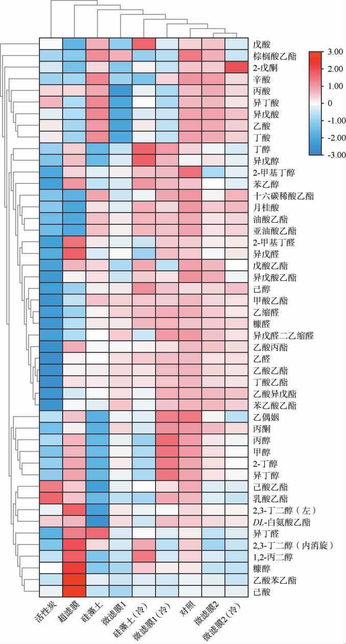 图5 不同过滤方式酒样风味物质聚类分析热图