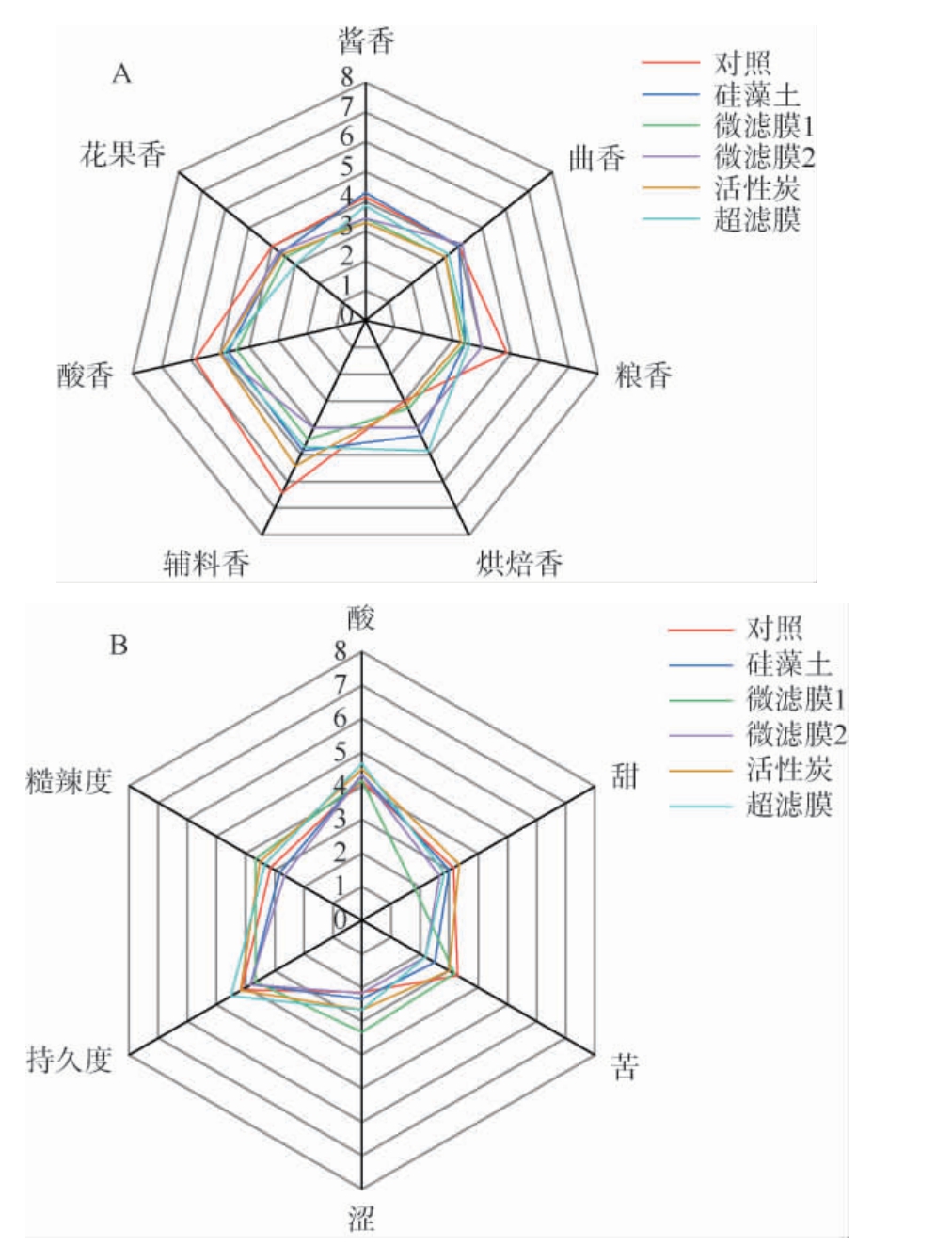 由图1B可知,在口感和口味方面,经微滤膜1过滤后,糙辣度、涩感有所增强,而甜感、持久度有所下降,口感表现最差。而其他过滤方式都表现出不同的感官体验,如硅藻土过滤、微滤膜2过滤明显降低了对照酒的糙辣度,但同时也降低了甜感,经超滤膜过滤、动态活性炭过滤后,一定程度上提升了酒体持久度,但同时增加了糙辣度和酸感。