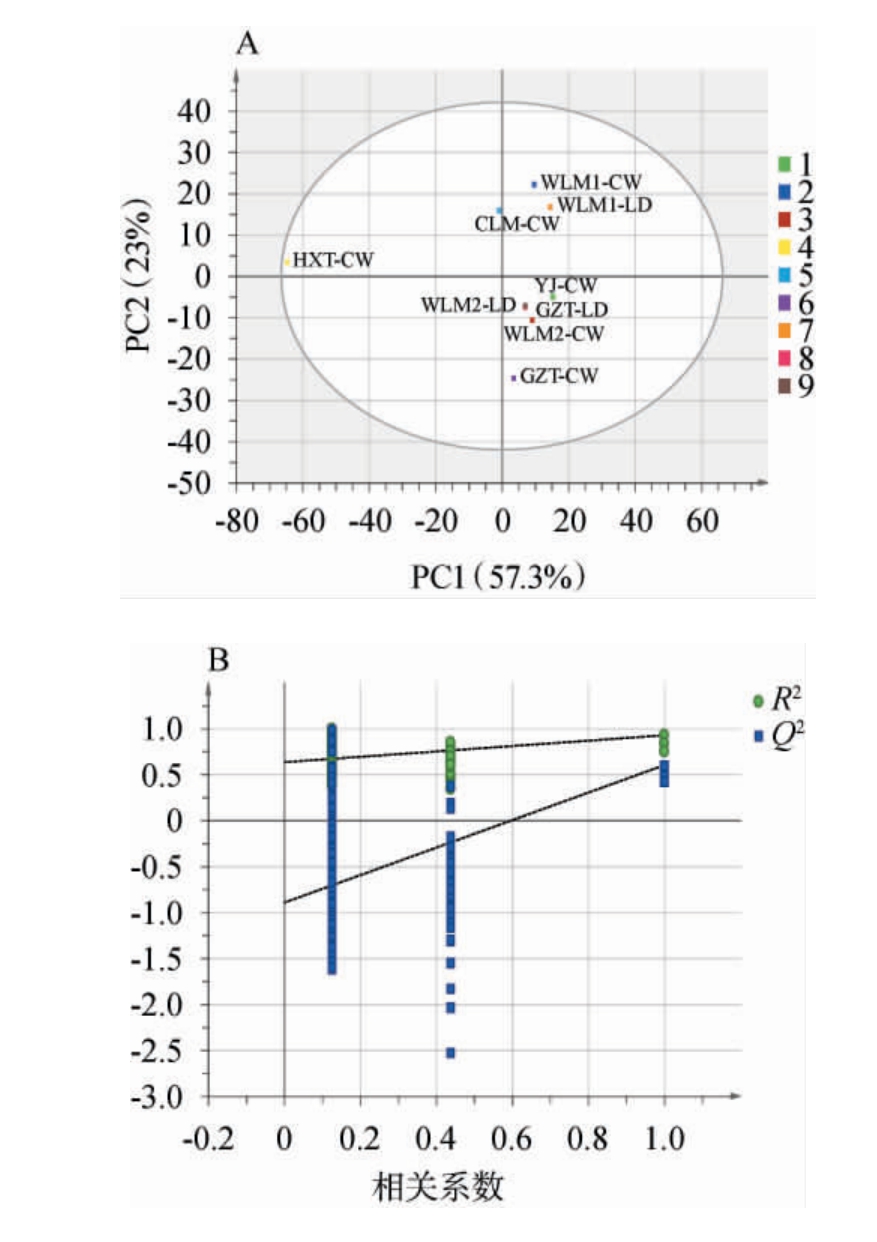 Fig.7 Score scatter plot of orthogonal partial least squares discriminant analysis (A) and permutation test results (B)