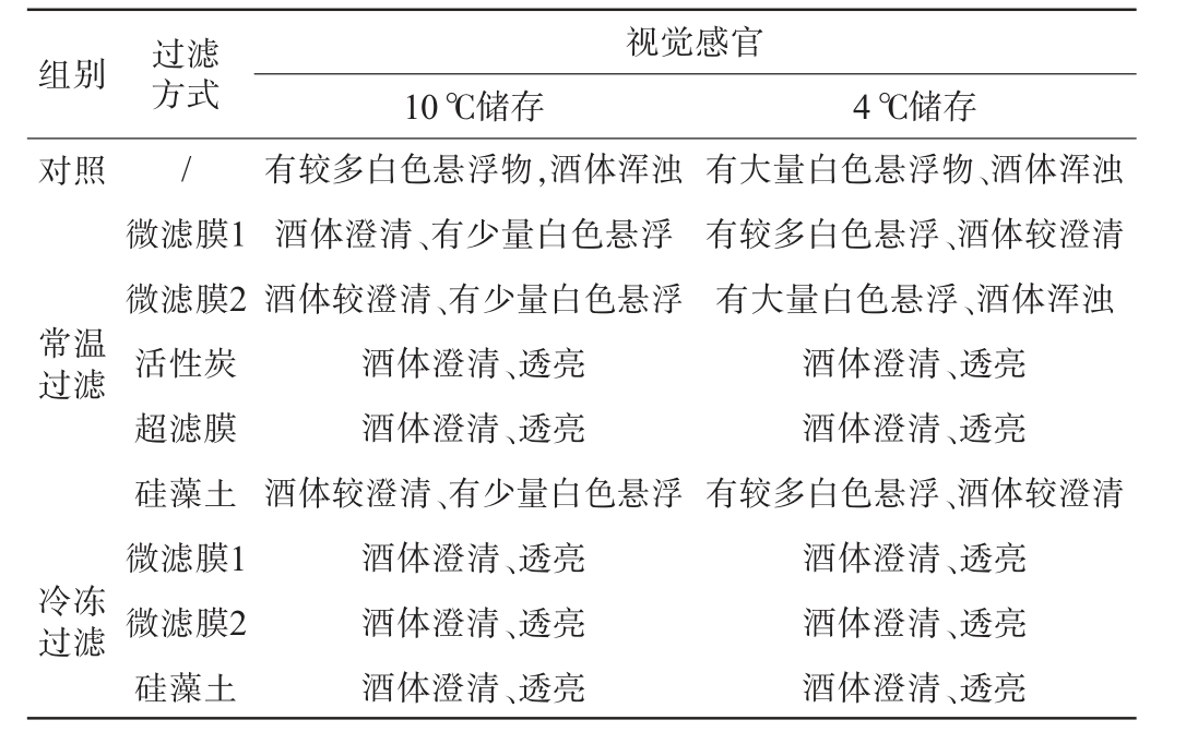 视觉感官10 ℃储存 4 ℃储存对照组别 过滤方式常温过滤冷冻过滤/微滤膜1微滤膜2活性炭超滤膜硅藻土微滤膜1微滤膜2硅藻土有较多白色悬浮物,酒体浑浊酒体澄清、有少量白色悬浮酒体较澄清、有少量白色悬浮酒体澄清、透亮酒体澄清、透亮酒体较澄清、有少量白色悬浮酒体澄清、透亮酒体澄清、透亮酒体澄清、透亮有大量白色悬浮物、酒体浑浊有较多白色悬浮、酒体较澄清有大量白色悬浮、酒体浑浊酒体澄清、透亮酒体澄清、透亮有较多白色悬浮、酒体较澄清酒体澄清、透亮酒体澄清、透亮酒体澄清、透亮