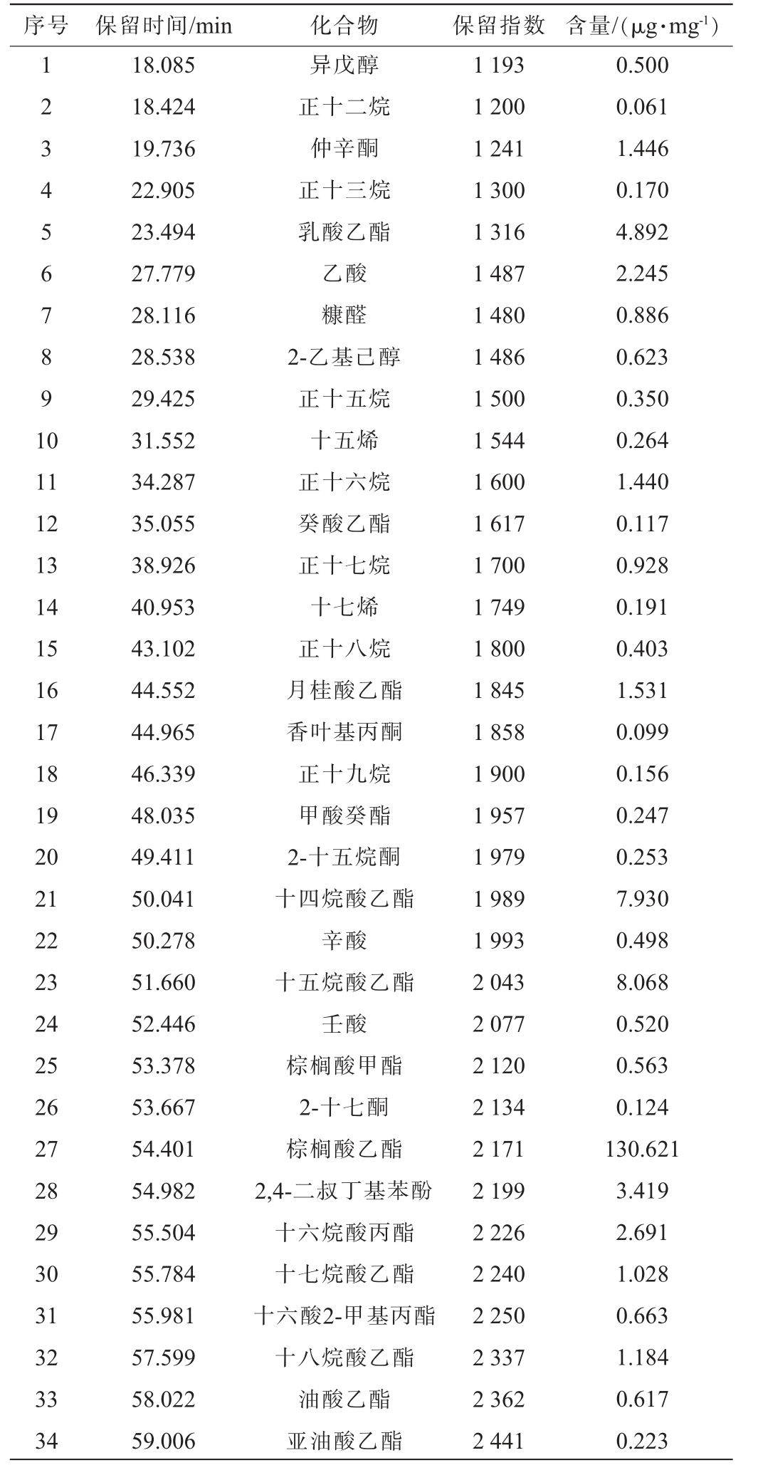 序号 保留时间/min 化合物 保留指数 含量/(μg·mg-1)1 2 34 56 78 91 0 11 12 13 14 15 16 17 18 19 20 21 22 23 24 25 26 27 28 29 30 31 32 33 34 18.085 18.424 19.736 22.905 23.494 27.779 28.116 28.538 29.425 31.552 34.287 35.055 38.926 40.953 43.102 44.552 44.965 46.339 48.035 49.411 50.041 50.278 51.660 52.446 53.378 53.667 54.401 54.982 55.504 55.784 55.981 57.599 58.022 59.006异戊醇正十二烷仲辛酮正十三烷乳酸乙酯乙酸糠醛2-乙基己醇正十五烷十五烯正十六烷癸酸乙酯正十七烷十七烯正十八烷月桂酸乙酯香叶基丙酮正十九烷甲酸癸酯2-十五烷酮十四烷酸乙酯辛酸十五烷酸乙酯壬酸棕榈酸甲酯2-十七酮棕榈酸乙酯2,4-二叔丁基苯酚十六烷酸丙酯十七烷酸乙酯十六酸2-甲基丙酯十八烷酸乙酯油酸乙酯亚油酸乙酯1 193 1 200 1 241 1 300 1 316 1 487 1 480 1 486 1 500 1 544 1 600 1 617 1 700 1 749 1 800 1 845 1 858 1 900 1 957 1 979 1 989 1 993 2 043 2 077 2 120 2 134 2 171 2 199 2 226 2 240 2 250 2 337 2 362 2 441 0.500 0.061 1.446 0.170 4.892 2.245 0.886 0.623 0.350 0.264 1.440 0.117 0.928 0.191 0.403 1.531 0.099 0.156 0.247 0.253 7.930 0.498 8.068 0.520 0.563 0.124 130.621 3.419 2.691 1.028 0.663 1.184 0.617 0.223