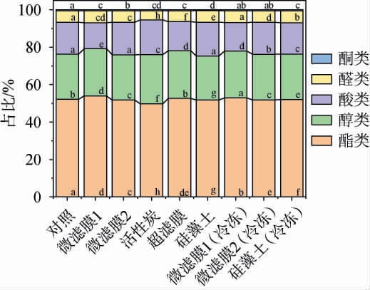 滤后酒样醇类化合物总量为3 250~3 750 mg/L,占比23.5%~26.3%。常温过滤组中,经微滤膜过滤后主要醇类化合物略有下降,经超滤膜过滤后基本无变化,经活性炭和硅藻土过滤后下降明显,分别减少了6.0%、8.4%,其中多元醇和β-苯乙醇变化较大,经活性炭过滤和硅藻土过滤后2,3-丁二醇(左旋)、2,3-丁二醇(内消旋)、1,2-丙二醇三种多元醇总量分别下降了29.6%、53.2%,β-苯乙醇分别下降了21.1%、8.5%。冷冻过滤组中,微滤膜2过滤同样是对多元醇含量影响较大,降低了17.9%,而硅藻土过滤后多元醇含量基本没变。 多元醇赋予白酒甜感和醇厚感,其含量降低可能是导致酒体在口味体验上持久度和甜感减弱的原因之一[28],而β-苯乙醇作为白酒中“花香”重要来源,其含量降低可能是导致酒体“花香”减弱的原因之一。