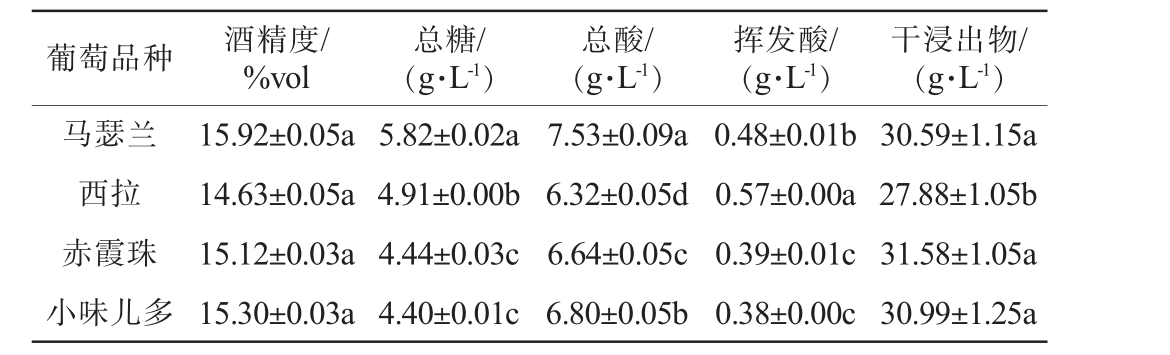 葡萄品种 酒精度/%vol总糖/(g·L-1)总酸/(g·L-1)挥发酸/(g·L-1)干浸出物/(g·L-1)马瑟兰西拉赤霞珠小味儿多15.92±0.05a 14.63±0.05a 15.12±0.03a 15.30±0.03a 5.82±0.02a 4.91±0.00b 4.44±0.03c 4.40±0.01c 7.53±0.09a 6.32±0.05d 6.64±0.05c 6.80±0.05b 0.48±0.01b 0.57±0.00a 0.39±0.01c 0.38±0.00c 30.59±1.15a 27.88±1.05b 31.58±1.05a 30.99±1.25a