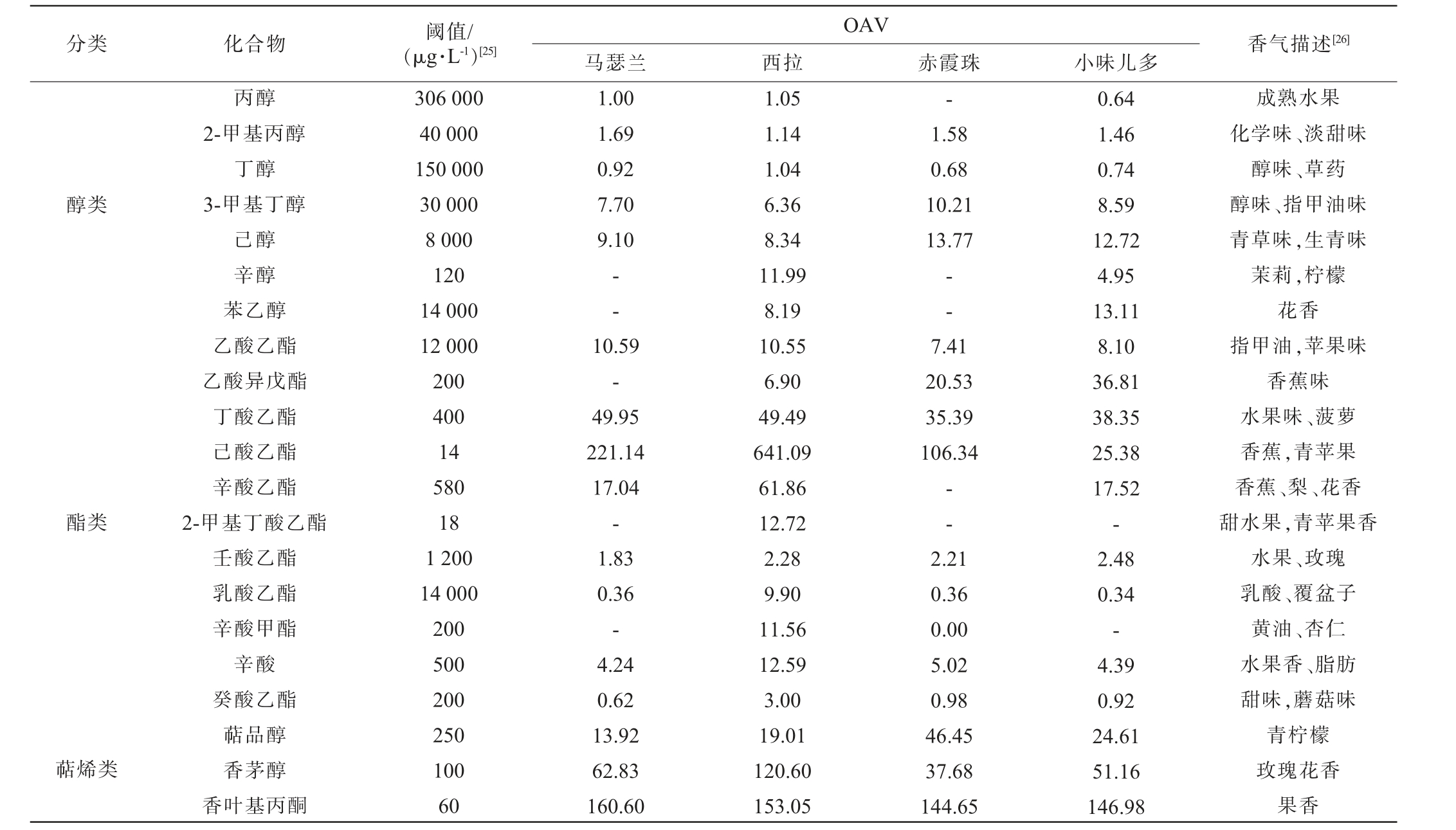 分类 化合物 阈值/(μg·L-1)[25] 香气描述[26]OAV马瑟兰 西拉 赤霞珠 小味儿多-醇类1.00 1.69 0.92 7.70 9.10 1.58 0.68 10.21 13.77丙醇2-甲基丙醇丁醇3-甲基丁醇己醇辛醇苯乙醇乙酸乙酯乙酸异戊酯丁酸乙酯己酸乙酯辛酸乙酯2-甲基丁酸乙酯壬酸乙酯乳酸乙酯辛酸甲酯辛酸癸酸乙酯萜品醇香茅醇香叶基丙酮306 000 40 000 150 000 30 000 8 000 120 14 000 12 000 200 400 14 580 18 1 200 14 000 200 500 200 250 100 60——7.41 20.53 35.39 106.34酯类--萜烯类10.59-49.95 221.14 17.04-1.83 0.36-4.24 0.62 13.92 62.83 160.60 1.05 1.14 1.04 6.36 8.34 11.99 8.19 10.55 6.90 49.49 641.09 61.86 12.72 2.28 9.90 11.56 12.59 3.00 19.01 120.60 153.05 2.21 0.36 0.00 5.02 0.98 46.45 37.68 144.65 0.64 1.46 0.74 8.59 12.72 4.95 13.11 8.10 36.81 38.35 25.38 17.52-2.48 0.34-4.39 0.92 24.61 51.16 146.98成熟水果化学味、淡甜味醇味、草药醇味、指甲油味青草味,生青味茉莉,柠檬花香指甲油,苹果味香蕉味水果味、菠萝香蕉,青苹果香蕉、梨、花香甜水果,青苹果香水果、玫瑰乳酸、覆盆子黄油、杏仁水果香、脂肪甜味,蘑菇味青柠檬玫瑰花香果香